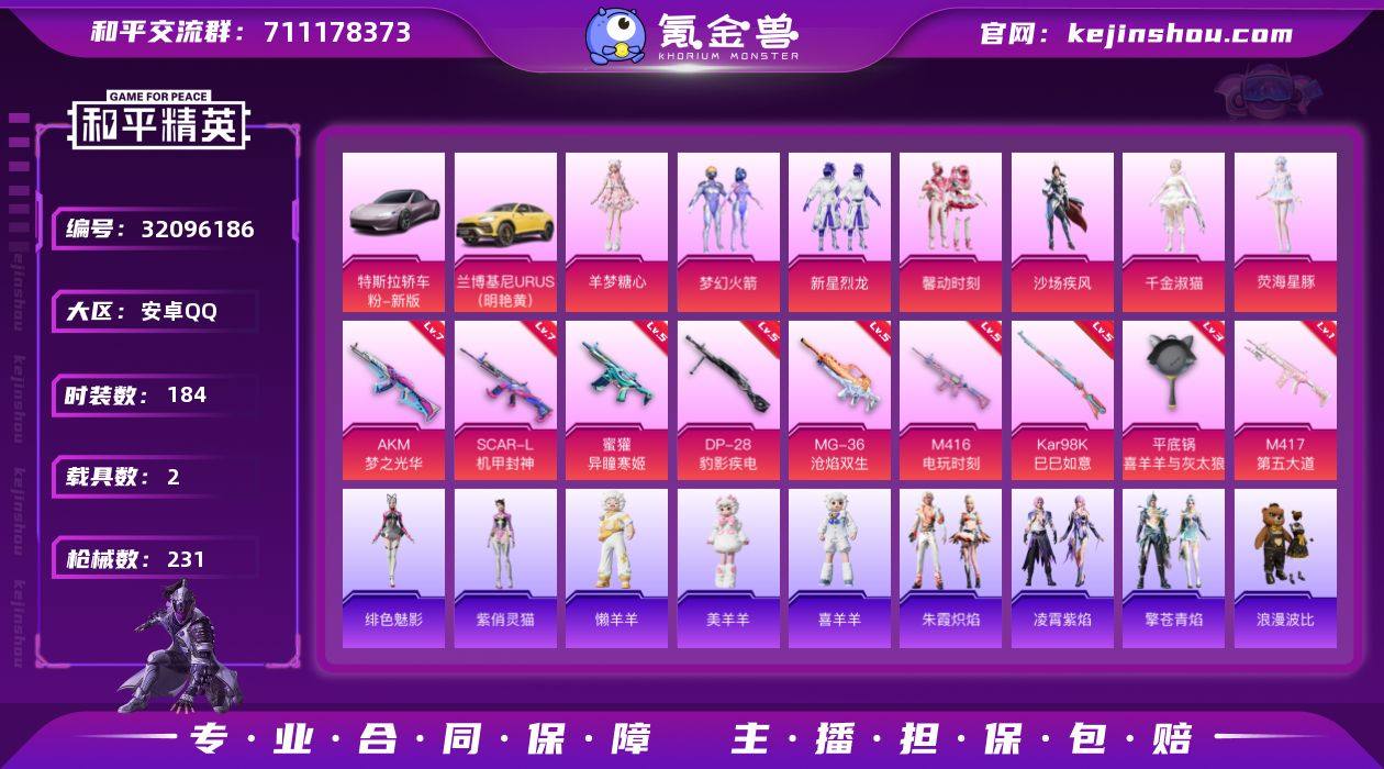 安卓 手Q-7粉装-9特效枪-2载具-0粉色飞行器-76429热力值-16王牌印记-184套装-231枪皮 【热门品类】:粉装-梦幻火箭,套装-浪漫天命,套装-龟仙人,套装-暗影哥特,套装-浪漫波比,套装-粉红小猪 【粉色套装】:粉装-梦幻火箭,粉装-新星烈龙,粉装-馨动时刻,粉装-沙场疾风,角色-千金淑猫,角色-荧海星豚,角色-羊梦糖心 【粉色枪皮等级】:AKM-梦之光华(七级),SCAR-L-机甲封神(七级),M416-电玩时刻(五级),蜜獾-异瞳寒姬(五级),Kar98K-巳巳如意(五级),M417-第五大道(一级),DP-28-豹影疾电(五级),MG-36-沧焰双生(五级),平底锅-喜羊羊与灰太狼(三级) 【粉色载具】:特斯拉Roadster(沁心粉),兰博基尼URUS(明艳黄) 【粉色枪皮】:AKM-梦之光华,SCAR-L-机甲封神,M416-电玩时刻,蜜獾-异瞳寒姬,Kar98K-巳巳如意,M417-第五大道,DP-28-豹影疾电,MG-36-沧焰双生,平底锅-喜羊羊与灰太狼 【粉色降落伞】:梦幻火箭降落伞,暗夜玫瑰降落伞,环太平洋降落伞,彩虹甜喵降落伞,第五大道降落伞,英伦信使降落伞,智耀战神降落伞,宁雨蝶降落伞,无垠阁降落伞,喜羊羊与灰太狼降落伞,异瞳寒姬降落伞 【稀有套装】:套装-龟仙人,套装-巳巳如意,套装-雏菊兔兔,套装-萝兰蝴蝶,套装-小熊娃娃,角色-狂花道·雅典娜,套装-糖糖葫芦,套装-青团波波,角色-都市丽猫,套装-燕燕于飞,套装-鱼渊荷华,套装-粉恋花,套装-紫幽梦,套装-蓝冰羽,套装-极速光影,套装-彩虹兔,套装-云朵鹅,套装-雪绒豹,套装-蜜露汐语,套装-朱霞炽焰,套装-凌霄紫焰,套装-擎苍青焰,玩偶服-懒羊羊,玩偶服-美羊羊,玩偶服-喜羊羊,角色-绯色魅影,角色-紫俏灵猫 【稀有枪皮】:AKM-奇异狩猎者,AKM-彩虹符号,AKM-江南烟雨,AKM-灼热熔岩,AKM-破晓战魂,AKM-缤纷海域,AKM-萌趣颜团子,AKM-萝萝小趴兔,AKM-龙的传人,M16A4-机械...