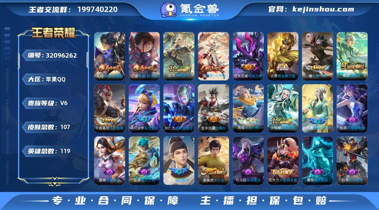 实名: 可修改 性别: 男号 贵族等级: V6 英雄数: 119 皮肤数: 107 传说皮: 黄金狮子座,云鹰飞将,久胜战神,地狱之眼,超时空战士-狄仁杰,妄想实况,惊梅引,神树通天,神骥·越千峰,神骥·逐星野 限定皮: 李小龙,鸣野蒿,逐霄战戟,愿照·九州拓 亮点: 【优质装备】:黄金狮子座,云鹰飞将(小将军),久胜战神,地狱之眼,超时空战士-狄仁杰,妄想实况,惊梅引