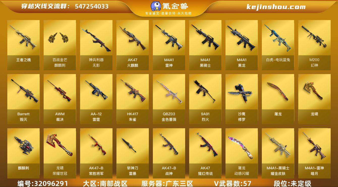 广东三区-68V-11王者武器数-0炫金武器数 【热门武器】:QBZ03-金色蔷薇,HK417-朱雀,M200-幻神,白虎-电玩蓝兔,M4A1-黑骑士,加特林-炼狱,降世魔童,沙鹰-修罗*3,荣耀世冠-龙啸,COP 357-极地霜雄 【王者炫金武器】:王者之魄 【音效卡】:M4A1-黑骑士音效卡,Barrett-毁灭音效卡 【皮肤】:幻神-周瑜皮肤,幻神-电竞之星 皮肤,QBZ03-荣耀世冠白鲨,金色蔷薇-电竞之星 皮肤,AWM-裁决-凤灵皮肤,裁决-羽掣 皮肤,雷神-暗月,雷神-荣耀之魄*5,火麒麟-华夏之心,火麒麟-平天大圣,火麒麟-心动糖果,毁灭-荣耀之怒,毁灭-星空,毁灭-CFS2020,毁灭-黑大圣皮肤,毁灭-英雄计划 皮肤,黑龙-能量核心,黑骑士耀金皮肤,无影-霓裳皮肤,战神-粉色甜心皮肤*2,战神-紫绶金章皮肤*7,战神-流金岁月皮肤*4,AK47-B-常胜将军-曹操,AK47-B-常胜将军-刘备*2,AK47-B-常胜将军-孙权,AWM-天龙-传奇白鲨*2,极光-能量核心,屠龙-春桃 皮肤*2 【角色】:王者-瞳-闭月羞花,王者-葵-貂蝉,乔伊教练,修道士,云海玲珑,幻面灵狐,暗夜-X,初恋灵狐,芳心审判者,风暴女,虎妞,嘉年华灵狐,兰-新年限定,零-水下丽影,灵狐-花神,灵狐者-X,灵狐者-黄金海岸,灵狐者-七夕宝贝,龙儿,龙儿-小淘气,曼陀罗-礼服,玫瑰花神,潘多拉-X,潘多拉-甜心教官,青霞仙子,斯沃特-X,蜀雪,铁骑荣耀,兔囡囡,维纳斯,雪莉杨,雪莉杨-摸金校尉,智影 【人偶武器】:闪光弹-小乔,高爆手雷-大乔,迷你超能女侍,降世魔童 【暴走生化】:超级对讲机 【挑战大师】:AK47-冰龙粉碎者 【英雄级武器】:AK47-火麒麟*2,M4A1-黑龙,M4A1-雷神*2,M4A1-黑骑士,HK417-朱雀,无影-神兵利器,QBZ03-金色蔷薇,9A91-烈火,王者之魄-觉醒版,AK-47-猩红传说*11,AK47-B-战神*2,AK47-B-常胜将军,白虎-电玩蓝兔,HK417-朱雀-电竞之星,Barrett-毁灭...