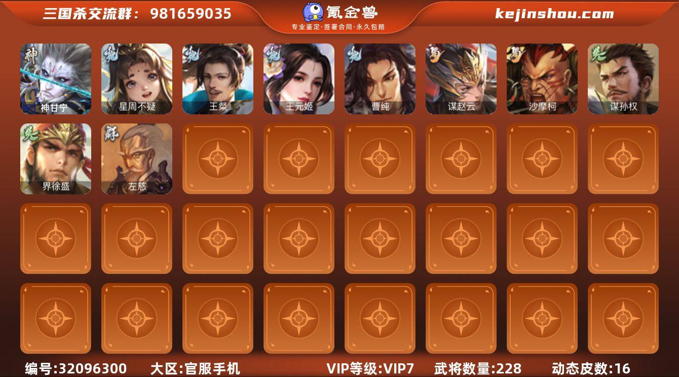 【416】官阶:领军将军;VIP等级:VIP7;史诗武将数量:11;动态皮肤数量:16;武将总数:228;史诗宝珠数量:7;将魂数量:2212;神将:3;魏国史诗武将:6;蜀国史诗武将:2;吴国史诗武将:2;群史诗武将:3 神甘宁,神吕蒙,神周瑜,星周不疑,王粲,王元姬,曹纯,谋赵云,沙摩柯,界徐盛,谋孙权,左慈,阎象,陈珪,神甘宁-万人辟易(动态),曹丕-气荡山河(动态),甄姬-明珠耀躯(动态),SP蔡文姬-兔年冬日(动态),关羽-明良千古(动态),马超-虎年冬至(动态),太史慈-涤荡江东(动态),周处-义除三害(动态),吕蒙-剑起惊澜(动态),孙权-永开吴祚(动态),徐盛-破军杀将(动态),袁绍-声震寰宇(动态)