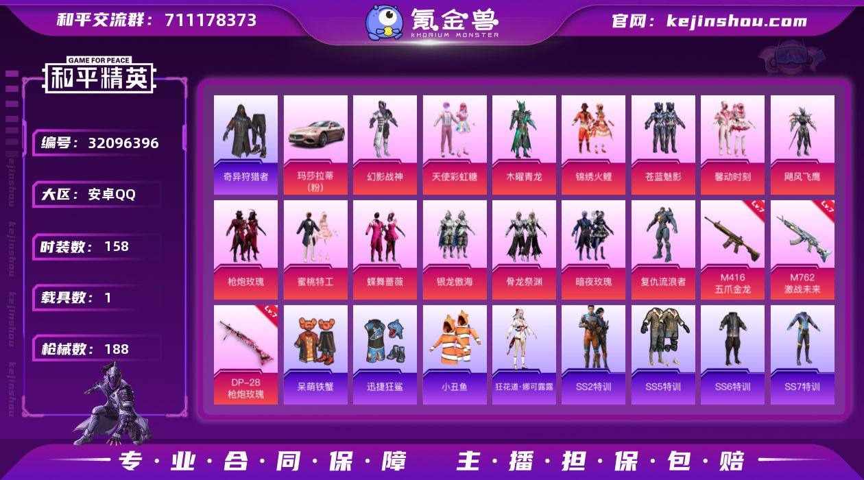 安卓 手Q-14粉装-3特效枪-1载具-3粉色飞行器-63954热力值-4王牌印记-158套装-188枪皮 【热门品类】:套装-小丑鱼,套装-奇异狩猎者 【粉色套装】:粉装-幻影战神,粉装-天使彩虹糖,粉装-木曜青龙,粉装-锦绣火鲤,粉装-苍蓝魅影,粉装-馨动时刻,粉装-飓风飞鹰,粉装-枪炮玫瑰,粉装-蜜桃特工,粉装-蝶舞蔷薇,粉装-银龙傲海,粉装-骨龙祭渊,粉装-暗夜玫瑰,角色-复仇流浪者 【粉色枪皮等级】:M416-五爪金龙(七级),M762-激战未来(七级),DP-28-枪炮玫瑰(七级) 【粉色载具】:玛莎拉蒂Ghibli(粉) 【粉色枪皮】:M416-五爪金龙,M762-激战未来,DP-28-枪炮玫瑰 【粉色飞行器】:风花雪月飞行器,闪光银龙飞行器,太空嘟嘟飞行器 【粉色降落伞】:极限特训降落伞,幻影战神降落伞,凝视深渊降落伞,至尊龙雀降落伞,春暖花开降落伞,精灵迷巫降落伞,神秘黑猫降落伞,夏日绵绵冰降落伞,香水柠檬降落伞,王牌四分卫降落伞,烈焰拳霸降落伞,枪炮玫瑰降落伞,焰龙焚天降落伞,暗夜玫瑰降落伞,洛神天依降落伞,风花雪月降落伞,海渊国主降落伞,天之羽翼降落伞,恐龙拽拽降落伞,橘柚倾心降落伞,冷魅冰骑降落伞,环太平洋降落伞,太空嘟嘟降落伞,第五大道降落伞,飒粉甜心降落伞,沙丘之主降落伞 【稀有套装】:角色-狂花道·娜可露露 【稀有枪皮】:AKM-四圣焕新,AKM-夜灯,AKM-彩虹符号,AKM-春暖花开,AKM-海渊国主,AKM-生命誓言,AKM-缤纷海域,AKM-虎虎生威,AKM-霓虹街区,M16A4-凝视深渊,M16A4-幻世战舞者,M16A4-甜心亚梦,M16A4-生命誓言,M16A4-红色方程式,SCAR-L-凝视深渊,SCAR-L-暗夜玫瑰,SCAR-L-炫彩节奏,SCAR-L-玉兔迎春,SCAR-L-王牌四分卫,SCAR-L-青丘仙客,SCAR-L-龙宫之主,M416-月影鸳鸯,M416-潮汐统领,GROZA-异彩先驱,GROZA-暗夜武装,GROZA-治愈之星,GROZA-生命誓言,GROZA-...