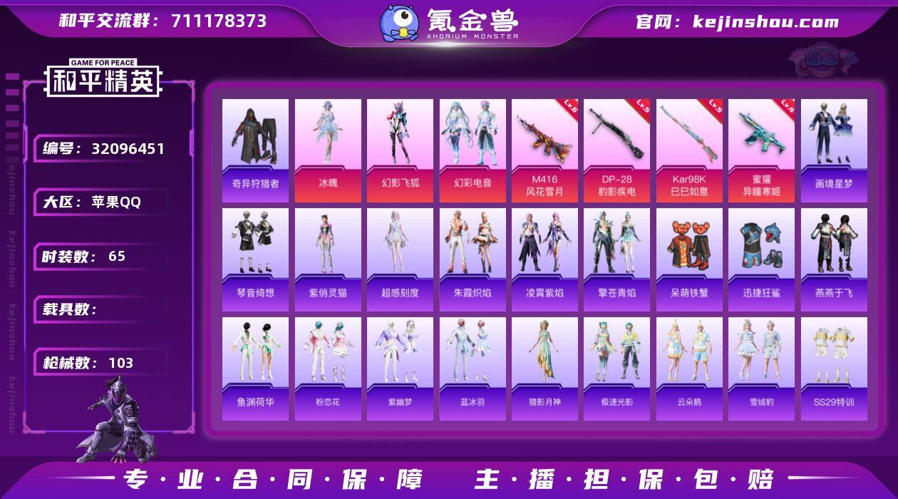 【特价出售/店主推荐】苹果 手Q-5粉装-5特效枪-0载具-1粉色飞行器-32542热力值-7王牌印记-75套装-106枪皮 【热门品类】:角色-Mark.06 【粉色套装】:粉装-宝贝奶油派,粉装-天使彩虹糖,角色-超弦星,粉装-幻影飞狐,角色-冷漠罗丽 【粉色枪皮等级】:AKM-绿萝繁花(五级),Kar98K-巳巳如意(五级),Mk14-甜梦熊击(五级),AMR-智耀战神(五级),MK12-雪月幻音(五级) 【粉色枪皮】:AKM-绿萝繁花,Kar98K-巳巳如意,Mk14-甜梦熊击,AMR-智耀战神,MK12-雪月幻音 【粉色飞行器】:星夜魔法师飞行翼 【粉色降落伞】:甜心宝贝降落伞,梦幻火箭降落伞,垂柳戏鸭降落伞,第五大道降落伞,千金淑猫降落伞,智耀战神降落伞,圣斗士星矢降落伞,星穹咏叹调降落伞,幻彩电音降落伞,冷漠罗丽降落伞,绯穹魔姬降落伞 【稀有套装】:玩偶服-酷勇熊大,玩偶服-憨乐熊二,套装-小鸟芋圆,套装-暖暖向日葵,角色-摩登魅猫,套装-紫幽梦,套装-蓝冰羽,角色-鲛海歌灵,套装-星影赞美诗,套装-霓虹热舞,套装-云朵鹅,套装-雪绒豹,套装-蓝海鲸歌,角色-夜瞳黯灵 【稀有枪皮】:AKM-彩虹符号,AKM-龙的传人,AKM-灵猫魔法师,M16A4-幻世战舞者,SCAR-L-黄金龙骨,M416-糯团青竹,M416-红色方程式,GROZA-彩虹符号,AUG-天降萌叽,AUG-耀粉歌者,QBZ-彩虹符号,M762-天降萌叽,M762-甜心宝贝,M762-云朵鹅,Mk47-炫光之旅,AC-VAL-天降萌叽,蜜獾-垂柳戏鸭,蜜獾-天降萌叽,蜜獾-娇憨猪猪,UZI-娇憨猪猪,UMP45-炫光之旅,Vector-焰鹰斗篷,汤姆逊-耀粉歌者,汤姆逊-智耀战神,P90-巳巳如意,Kar98K-星穹咏叹调,AWM-焰鹰斗篷,AWM-垂柳戏鸭,Mini14-梦幻火箭,Mini14-炫彩节奏,SLR-娇憨猪猪,SLR-彩虹符号,SLR-墨龙九天,SVD-云朵鹅,S686-彩虹符号,S686-千金淑猫,S1897-炫彩节奏,S1897-荧海星豚,S12K-垂柳戏鸭,S12K-娇憨猪猪...