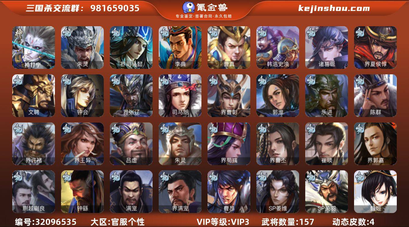 官阶: 先锋将军 VIP等级: VIP3 武将数量: 157 动态皮肤数量: 4 神将: 神甘宁 魏国武将: 徐庶,张辽,SP关羽,SP贾诩,SP姜维,曹昂,曹操,曹洪,曹丕,曹仁,界满宠,满宠,钟繇,蒯越蒯良,郭嘉,荀彧,界郭嘉,崔琰,界曹丕,界荀彧,朱灵,吕虔,界王异,界许褚,陈群,乐进,郭淮,界曹彰,夏侯惇,曹植,司马朗,许褚,界张辽,钟会,文聘,界夏侯惇,诸葛诞,司马懿,甄姬,徐晃,韩浩史涣,曹真,典韦,夏侯渊,李典,于禁,邓艾,界司马懿,朱灵(国战) 蜀国武将: 徐庶,界伊籍,赵云,张松,彭羕,李丰,刘封,谋庞统,黄月英,关羽,吴懿,张飞,魏延,界法正,刘禅,张翼,关银屏,SP孙尚香,卧龙诸葛,周仓,简雍,界关兴张苞,诸葛亮,法正,界简雍,界马岱,关平,庞统,马超,廖化,关兴张苞,孟获,夏侯氏,黄忠,刘备,界马超,李严,马良,彭羕(国战),甘夫人,SP甘夫人 吴国武将: 周泰,吕蒙,界孙权,陈武董袭,凌操,孙尚香,程普,大乔,韩当,陆逊,诸葛瑾,太史慈,虞翻,界黄盖,孙鲁班,界周瑜,卫温诸葛直,孙权,界甘宁,甘宁,界大乔,孙坚,周瑜,小乔,潘璋马忠,黄盖,界陆逊,徐盛,张昭张纮,陈武蕫袭,界张昭张纮,孙邵,朱桓,张布 群国武将: 张让,华雄,袁术,高顺,于吉,界公孙瓒,吕布,张梁,李儒,界貂蝉,公孙瓒,蔡夫人,界刘表,界袁术,SP马超,界华佗,贾诩,庞德,张宝,董卓,张角,曹节,袁绍,华佗,貂蝉,伏皇后,界伏皇后,公孙渊,蔡邕,颜良文丑,张鲁,谋高顺,邹氏,贾充,马腾,友庞统