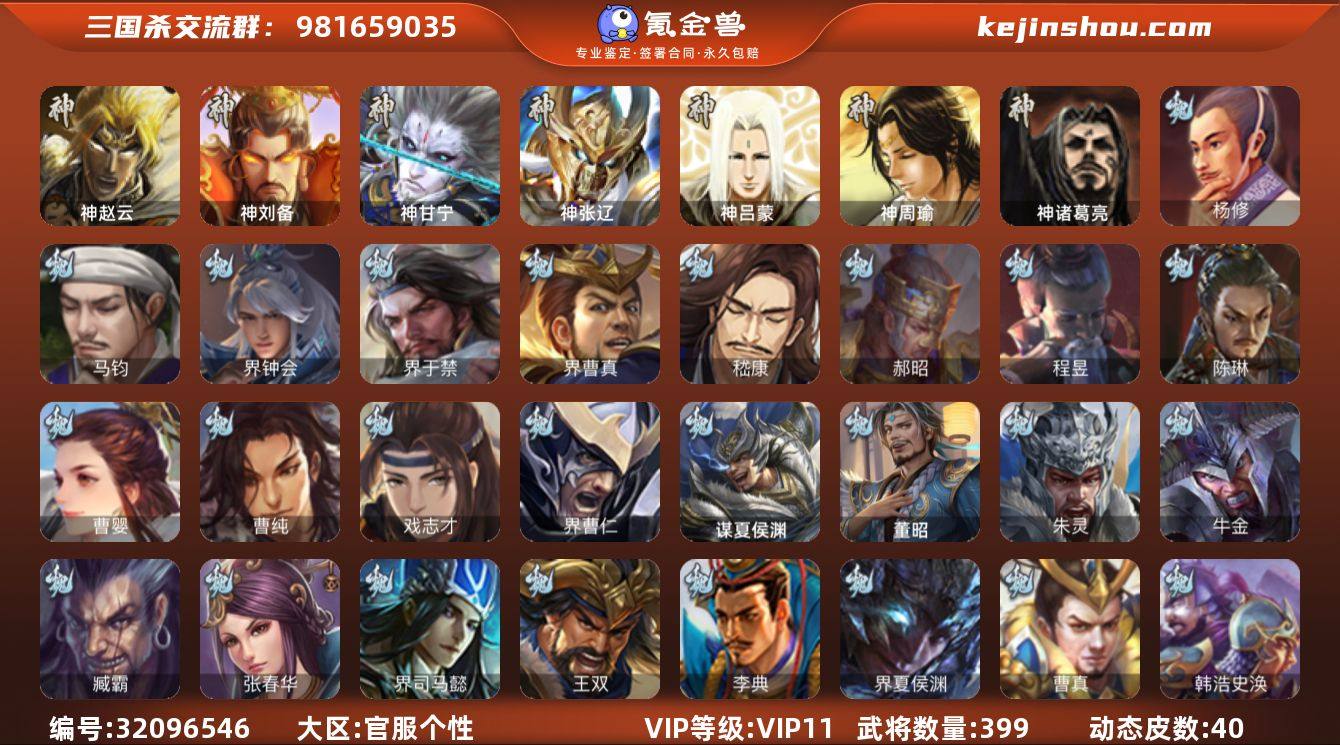 官阶: 大将军 VIP等级: VIP11 武将数量: 399 动态皮肤数量: 40 神将: 神甘宁,神刘备,神张辽,神赵云,神吕蒙,神周瑜,神诸葛亮 魏国武将: 戏志才,曹纯,曹婴,陈琳,程昱,郝昭,嵇康,界曹真,界于禁,界钟会,马钧,杨修,徐庶,张辽,SP蔡文姬,SP曹仁,SP关羽,SP贾诩,SP姜维,SP庞德,卞夫人,蔡贞姬,曹昂,曹操,曹冲,曹洪,曹丕,曹仁,曹叡,贾逵,王异,张恭,鲁芝,界满宠,曹休,界曹植,满宠,荀攸,王基,钟繇,蒯越蒯良,郭嘉,荀彧,杜畿,界郭嘉,崔琰,界曹丕,界荀彧,朱灵,界甄姬,吕虔,界陈群,界王异,界许褚,界郭淮,华歆,陈群,界邓艾,界典韦,界曹休,袁涣,李通,乐进,辛宪英,郭淮,毛玠,界曹彰,郭皇后,毌丘俭,夏侯惇,曹植,司马朗,谋于禁,界曹操,许褚,界张辽,谋徐晃,张郃,钟会,文聘,曹彰,界夏侯惇,诸葛诞,司马懿,甄姬,界徐晃,徐晃,界曹仁,孙资刘放,韩浩史涣,曹真,典韦,界夏侯渊,夏侯渊,李典,于禁,王双,邓艾,界司马懿,张春华,臧霸,牛金,朱灵(国战),董昭,谋夏侯渊 蜀国武将: 关索,花鬘,界黄忠,谯周,沙摩柯,王平,张星彩,赵襄,诸葛瞻,谋马超,马云騄,徐庶,界魏延,杨仪,吕凯,界关羽,界诸葛亮,邓芝,界伊籍,费祎,严颜,界黄月英,界张嶷,赵云,张松,彭羕,李丰,界刘备,界刘禅,谋姜维,刘封,糜竺,谋庞统,黄月英,关羽,王甫赵累,吴懿,吴班,界廖化,向宠,祝融,张飞,黄皓,陈震,魏延,界周仓,马忠,界法正,糜夫人,界孟获,刘禅,界赵云,界姜维,张翼,关银屏,界祝融,SP孙尚香,SP徐庶,卧龙诸葛,宗预,周仓,简雍,界关兴张苞,诸葛亮,孙乾,界张飞,界卧龙诸葛,法正,界简雍,赵统赵广,陈到,界马岱,关平,马岱,界庞统,庞统,诸葛果,谋张飞,马谡,马超,廖化,关兴张苞,孟获,秦宓,吴苋,夏侯氏,姜维,黄忠,刘备,界马超,李严,马良,蒋琬费祎,刘谌,彭羕(国战),甘夫人,SP甘夫人 吴国武将: 贺齐,界徐盛,界朱然,留赞,骆统,孙皓,潘濬,陆绩,张温,周泰,全琮,吕蒙,SP庞统,诸葛恪,界孙尚香,大乔小乔,桥公,...