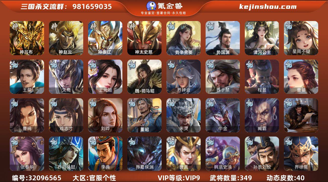 官阶: 大将军 VIP等级: VIP9 武将数量: 349 动态皮肤数量: 40 神将: 神吕布,神太史慈,神张辽,神赵云 魏国武将: 刘晔,戏志才,曹纯,曹婴,程昱,界于禁,界钟会,魏-司马昭,王元姬,文鸯,王粲,唐咨-魏,徐庶,张辽,SP蔡文姬,SP曹仁,SP关羽,SP贾诩,SP姜维,SP庞德,卞夫人,蔡贞姬,曹昂,曹操,曹冲,曹洪,曹丕,曹仁,曹叡,王异,张恭,鲁芝,曹休,界曹植,满宠,荀攸,钟繇,蒯越蒯良,郭嘉,荀彧,阮慧,杜畿,界郭嘉,崔琰,界曹丕,界荀彧,朱灵,吕虔,界王异,界许褚,界郭淮,华歆,陈群,界曹休,袁涣,李通,乐进,辛宪英,郭淮,界曹彰,郭皇后,夏侯惇,曹植,司马朗,谋于禁,界曹操,星周不疑,许褚,界张辽,谋徐晃,张郃,钟会,文聘,曹彰,界夏侯惇,诸葛诞,司马懿,甄姬,界徐晃,徐晃,孙资刘放,韩浩史涣,曹真,典韦,界夏侯渊,夏侯渊,李典,于禁,邓艾,界司马懿,张春华,孟达-魏,臧霸,牛金,朱灵(国战),清河公主,董昭,势国渊,势辛宪英 蜀国武将: 花鬘,谯周,谋马超,谋赵云,马云騄,徐庶,杨仪,吕凯,界关羽,界诸葛亮,邓芝,界伊籍,费祎,严颜,赵云,张松,彭羕,李丰,界刘备,刘封,糜竺,蒋琬,谋庞统,黄月英,刘巴,关羽,吴懿,向宠,祝融,张飞,黄皓,魏延,界周仓,马忠,界法正,糜夫人,界孟获,刘禅,界赵云,张翼,关银屏,界祝融,SP孙尚香,SP徐庶,卧龙诸葛,周仓,简雍,界关兴张苞,诸葛亮,孙乾,界张飞,法正,界简雍,陈到,界马岱,关平,马岱,界庞统,庞统,诸葛果,谋张飞,马谡,马超,霍峻,廖化,关兴张苞,谋关羽,孟获,夏侯氏,黄忠,刘备,李严,马良,傅肜,许靖,刘谌,蜀-孟达,彭羕(国战),甘夫人,SP甘夫人,势魏延,势陈祗 吴国武将: 界步练师,界徐盛,界朱然,留赞,骆统,文鸯,潘濬,张温,周泰,全琮,吕蒙,诸葛恪,界孙尚香,大乔小乔,桥公,谋周瑜,界程普,丁奉,谋吕蒙,周鲂,孙茹,蒋钦,顾雍,阚泽,孙亮,孙休,严畯,界孙权,孙翊,界孙休,界凌统,祖茂,濮阳兴,界虞翻,界吕蒙,陈武董袭,界孙策,凌操,朱治,孙尚香,程普,大乔,...
