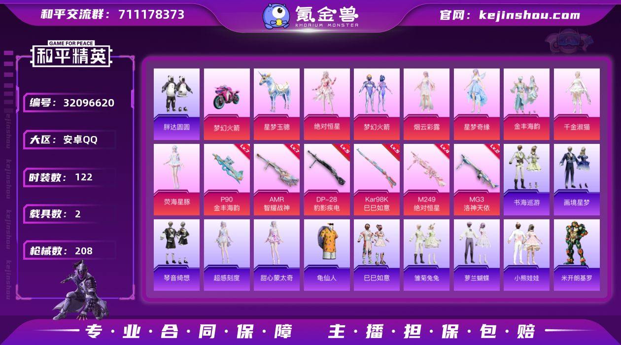 安卓 手Q-7粉装-8特效枪-2载具-7粉色飞行器-63698热力值-17王牌印记-122套装-208枪皮 【热门品类】:粉装-梦幻火箭,套装-胖达圆圆,套装-龟仙人 【粉色套装】:角色-绝对恒星,粉装-梦幻火箭,角色-烟云彩露,角色-星梦奇缘,粉装-金丰海韵,角色-千金淑猫,角色-荧海星豚 【粉色枪皮等级】:AKS-74U-森灵之息(五级),P90-金丰海韵(七级),Kar98K-巳巳如意(五级),Mk14-福马献瑞(五级),AMR-智耀战神(七级),M249-绝对恒星(四级),DP-28-豹影疾电(五级),MG3-洛神天依(二级) 【粉色载具】:双人摩托-梦幻火箭,星梦玉骢 【粉色枪皮】:AKS-74U-森灵之息,P90-金丰海韵,Kar98K-巳巳如意,Mk14-福马献瑞,AMR-智耀战神,M249-绝对恒星,DP-28-豹影疾电,MG3-洛神天依 【粉色飞行器】:绝对恒星飞行器,炫彩糖果飞行器,梦幻火箭飞行器,星梦奇缘飞行器,深渊漩涡飞行器,晶梦幻蝶飞行器 【粉色降落伞】:绝对恒星降落伞,梦幻火箭降落伞,洛神天依降落伞,圣堂之誓降落伞,星梦奇缘降落伞,金丰海韵降落伞,拳皇·狂花道降落伞,千金淑猫降落伞,星穹咏叹调降落伞,冷漠罗丽降落伞,极意拳锋降落伞,炫彩糖果降落伞,回旋牧梦使降落伞 【稀有套装】:套装-龟仙人,套装-巳巳如意,角色-超感刻度,角色-甜心蒙太奇,套装-雪国风尚,套装-炫彩糖果,套装-马上有钱,套装-雏菊兔兔,套装-萝兰蝴蝶,套装-小熊娃娃,角色-米开朗基罗,角色-狂花道·娜可露露,套装-糖糖葫芦,套装-青团波波,角色-都市丽猫,角色-光矢逐梦,套装-燕燕于飞,套装-鱼渊荷华,套装-紫幽梦,套装-蓝冰羽,套装-云朵鹅,套装-雪绒豹,角色-乐音,套装-书海巡游,套装-画境星梦,套装-琴音绮想,套装-雨过天青,套装-红釉青花 【稀有枪皮】:AUG-冰晶雪宝,AKM-彩虹符号,AKM-破晓战魂,AKM-霓虹街区,AKM-龙的传人,M16A4-幻世战舞者,SCAR-L-...