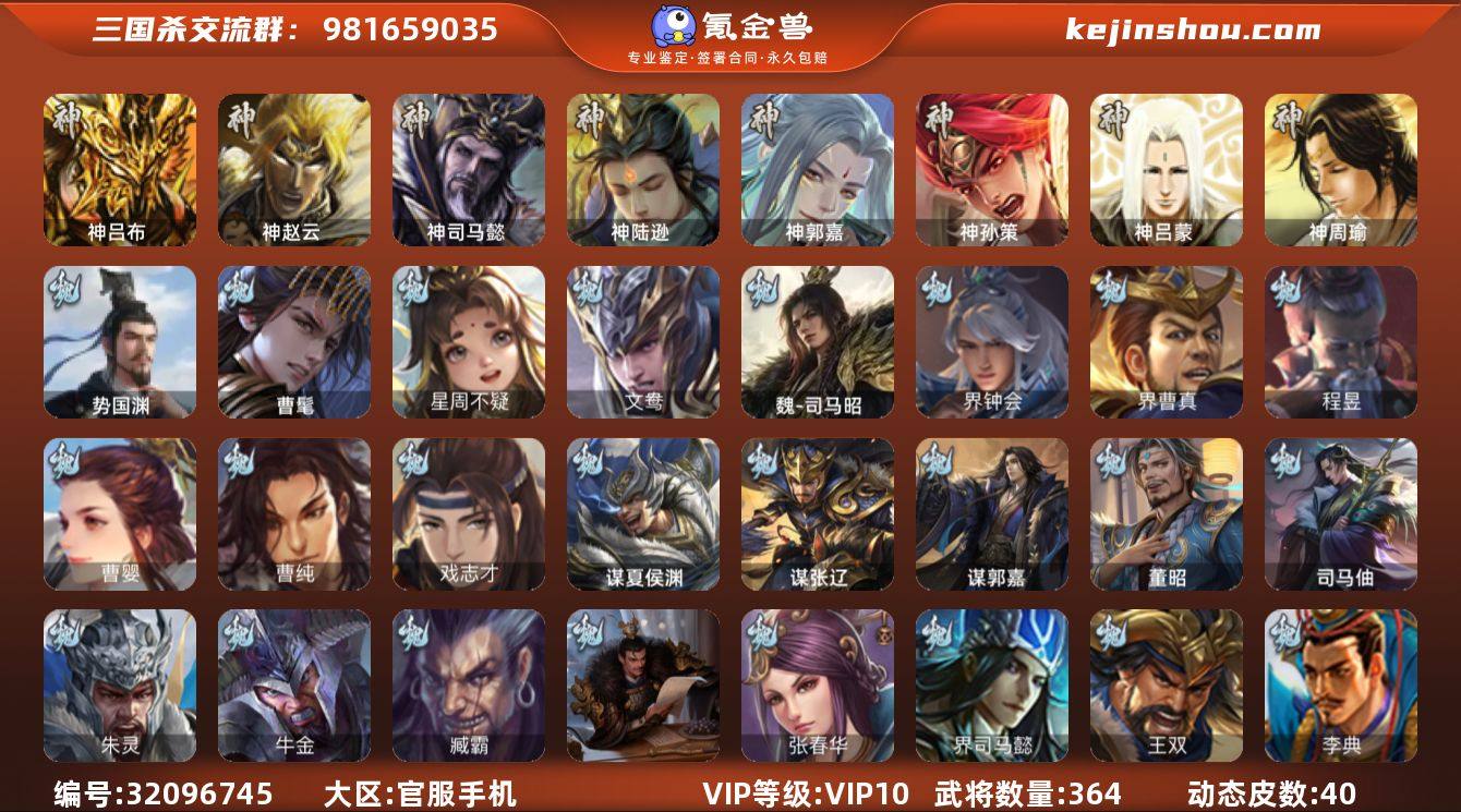 官阶: 大将军 VIP等级: VIP10 武将数量: 364 动态皮肤数量: 40 神将: 神郭嘉,神陆逊,神吕布,神司马懿,神孙策,神赵云,神吕蒙,神周瑜 魏国武将: 戏志才,曹纯,曹婴,程昱,界曹真,界钟会,魏-司马昭,文鸯,徐庶,张辽,SP蔡文姬,SP曹仁,SP关羽,SP贾诩,SP姜维,SP庞德,卞夫人,蔡贞姬,曹昂,曹操,曹冲,曹洪,曹丕,曹仁,曹叡,王异,张恭,鲁芝,界满宠,界曹植,满宠,荀攸,王基,钟繇,郭嘉,牵招,荀彧,阮慧,杜畿,界郭嘉,崔琰,界荀彧,朱灵,界甄姬,辛毗,吕虔,界王异,界许褚,界郭淮,华歆,陈群,界邓艾,界曹休,袁涣,乐进,辛宪英,郭淮,郭皇后,夏侯惇,司马朗,谋于禁,界曹操,星周不疑,许褚,界张辽,张郃,钟会,文聘,曹彰,界夏侯惇,诸葛诞,司马懿,甄姬,杨阜,徐晃,韩浩史涣,曹真,典韦,界夏侯渊,夏侯渊,李典,于禁,王双,邓艾,界司马懿,张春华,孟达-魏,臧霸,牛金,朱灵(国战),曹髦,司马伷,董昭,谋郭嘉,谋张辽,谋夏侯渊,势国渊 蜀国武将: 董允,花鬘,界黄忠,谯周,谋马超,谋赵云,徐庶,杨仪,吕凯,界关羽,界诸葛亮,邓芝,界伊籍,费祎,严颜,界黄月英,界张嶷,赵云,张松,彭羕,李丰,界刘备,谋姜维,刘封,糜竺,李遗,谋庞统,黄月英,刘巴,关羽,吴懿,吴班,向宠,祝融,张飞,黄皓,陈震,魏延,界周仓,马忠,界法正,糜夫人,刘禅,界赵云,谋诸葛亮,界姜维,张翼,关银屏,SP孙尚香,SP徐庶,卧龙诸葛,周仓,简雍,界关兴张苞,诸葛亮,界张飞,法正,界马岱,关平,马岱,界庞统,庞统,诸葛果,谋张飞,马谡,马超,霍峻,来敏,廖化,关兴张苞,谋关羽,孟获,夏侯氏,姜维,黄忠,刘备,界马超,马良,傅肜,蒋琬费祎,刘谌,蜀-孟达,彭羕(国战),甘夫人,蜀-糜芳傅士仁,势魏延 吴国武将: 界徐盛,界朱然,留赞,骆统,周处,文鸯,界朱桓,潘濬,周泰,全琮,吕蒙,诸葛恪,界孙尚香,界顾雍,大乔小乔,谋周瑜,许贡,丁奉,谋吕蒙,孙茹,蒋钦,顾雍,界朱治,孙休,严畯,界孙权,界孙休,界凌统,祖茂,濮阳兴,界虞翻,界吕蒙,陈武董袭,孙登,凌...