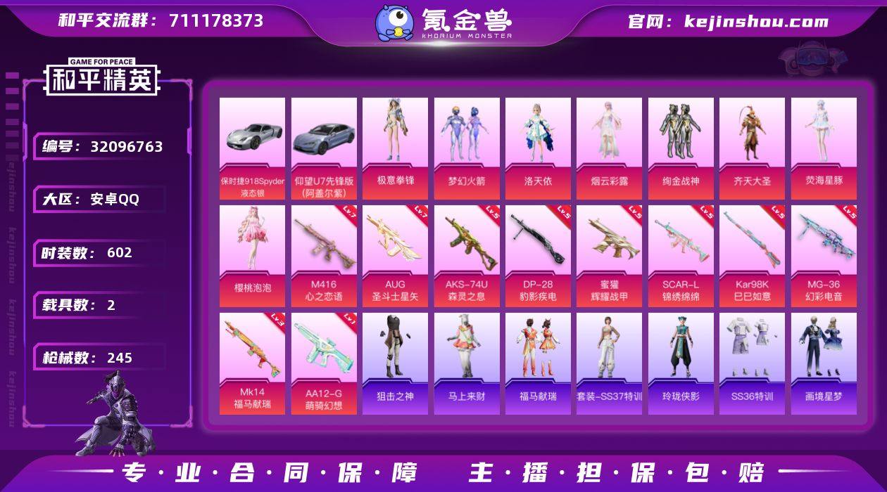 实名:可二次实名 是否支持人脸包赔:支持 粉装数量:8 特效枪数量:10 载具数:2 时装数:602 枪械数:245 极意拳锋,洛天依,梦幻火箭,齐天大圣,绚金战神,荧海星豚,樱桃泡泡,烟云彩露 七级AUG-圣斗士星矢,七级M416-心之恋语,五级AKS-74U-森灵之息,五级DP-28-豹影疾电,五级Kar98K-巳巳如意,五级MG-36-幻彩电音,五级蜜獾-辉耀战甲,五级SCAR-L-锦绣绵绵,三级MK14-福马献瑞,一级AA12-G-萌骑幻想 保时捷918Spyder(液态银),仰望U7先锋版(阿盖尔紫) 狙击之神,马上来财,福马献瑞,SS37特训,玲珑侠影,画境星梦,琴音绮想,SS36特训,炫彩糖果,萌鸡速递,紫俏灵猫,风迹短诗,SS35特训,午间小调,元气之梦,薄荷星砂,狂鲨锋刃,凌霄紫焰,SS34特训套装,朱霞炽焰,8号机,缤纷果语,滨海厨神,滨海假日,冰河战士,白色伏地魔,白熊同盟,春光漫游,彩虹兔,雏菊兔兔,长空猛禽,潮流炫酷,创世·追猎,纯真浪花,达芬奇,顶瓜瓜,蝶变,大橘大利,都市魅力,都市漫游者,电音精灵,粉恋花,福星高照,飞行日记,龟仙人,光之冒险,海岛探路者,鹤鸣,虎虎生威吉莉,湖蓝色名流,黑色伏地魔,黄色伏地魔,黄色名流,黄色运动,红色运动,幻世战舞者,和煦暖阳,湖雨初晴,幻羽潜行,幻影武者,酒红色名流,惊鸿侠骨,橘黑制服,娇憨猪猪,竞技达人朋克,竞技名士,极速红龙,精神漫游,街头潮人,锦衣飞扬,快闪甜心,空投萌叽,蓝冰羽,蓝彩潮人,龙的传人,龙魂突击队,猎鹰,萝兰蝴蝶,黎明保卫者,蓝色运动,恋语绒绒,冷焰舞者,Mark.06,猛禽,魅力单车,萌趣咩咩,霓虹街区,怒火燎原,柠萌假日,破蛋小黄鸡,破晓战魂,轻风白浪,绮丽涂鸦,青芒树下,青年教官,云朵鹅,热情海星,人气偶像,热血青春,深海梦境,深蓝色名流,森林游猎者,SS17特训,SS18特训,SS19特训,SS21特训,SS22特训,SS23特训,SS24特训,SS25特训,SS26特训,SS27特训,SS28特训,SS29特训,SS30特训套装,SS31特训套装,SS32特训套装,SS33特训套装,巳巳如意,天籁歌者,甜蜜熊情侣,糖霜甜心,特训学院,田园牧歌,特战英豪,WiFi精灵,完美偶像,王牌教练,迅捷狂鲨,雪绒豹,旭日情侣,夏日倾情,夏日音浪,星影赞美诗,耀粉歌者,荧惑魅影,银尘,樱梦幻音,玉兔迎春,焰鹰斗篷,鱼渊荷华,耀眼新星,燕燕于飞,异域银装,战地督导,装甲骑士,紫幽梦,灼焰舞者 炫彩糖果飞行器,冠军兔兔飞行器,时光之吻飞行器,星之彼岸飞行器,罪夜之冕降落伞,炫彩糖果降落伞,异瞳寒姬降落伞,百万伏特降落伞,创世·救赎降落伞,金丰海韵降落伞,精灵梦叶罗丽降落伞,江南烟雨降落伞,临安公主降落伞,梦幻火箭降落伞,熔岩统帅降落伞,星空武士降落伞,星穹咏叹调降落伞,旋转彩虹降落伞,樱桃泡泡降落伞,智耀战神降落伞,猪猪侠降落伞 卖家说:避难所已升满,天赋满级,有装备,小极品男神号,特权卡还有200多天