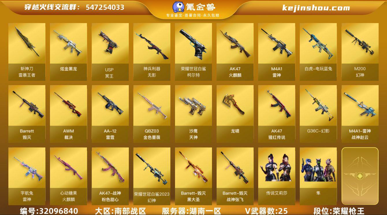 湖南一区-34V-7王者武器数-1炫金武器数 【传说角色】:传说艾莉莎 【热门武器】:G36C-幻影,QBZ03-金色蔷薇,M200-幻神,柯尔特-荣耀世冠白鲨2023*2,白虎-电玩蓝兔,COP-白鲨 【王者炫金武器】:斩神刀-雷暴王者,炫金黑龙 【音效卡】:G36C-幻影音效卡 【皮肤】:幻神-荣耀世冠白鲨2023 皮肤,幻神-荣耀世冠EP 皮肤,金色蔷薇-电竞之星 皮肤,裁决-星际旅行 皮肤,裁决-量子聚变 皮肤,M4A1-战神赵云,雷神-宇航兔皮肤,火麒麟-心动糖果,毁灭-战神张飞,毁灭-黑大圣皮肤,毁灭-英雄计划 皮肤,幻影-量子聚变 皮肤,战神-粉色甜心皮肤 【角色】:隼,幻面灵狐,北极狐-X,芳心审判者,风暴女,嘉年华灵狐,娟娟,兰-新年限定,潘多拉-X,潘多拉-甜心教官,青霞仙子,斯沃特-X,兔囡囡,夜玫瑰-幻能朋克,幽 【人偶武器】:COP-白鲨,AWM-灵狐-15周年嘉年华,迷你牛牛,深渊终结者手雷,迷你超能女侍 【挑战大师】:AK47-冰龙粉碎者,神圣爆裂者-末日III 【英雄级武器】:AK47-火麒麟*2,M4A1-雷神,无影-神兵利器,G36C-幻影,QBZ03-金色蔷薇,AK-47-猩红传说,白虎-电玩蓝兔,HK417-朱雀-电竞之星,Barrett-毁灭,AWM-裁决,M200-幻神,AA-12-雷霆,沙鹰-天神*2,柯尔特-荣耀世冠白鲨2023*2,USP-冥王,龙啸,高爆手雷-雷暴王者*2,高爆手雷-量子之心,闪光弹-神工天巧,闪光弹-雷暴王者*2,烟雾弹-雷暴王者*2 【道具】:泡泡象背包,CFS限定背包,冰冰企鹅背包,超级背包,绿色巨人,灵魂忍者,迷雾幽灵,夺命之镰*2,防化服*2,金色流光-枪王排位,枪王排位29赛季金色流光,电玩兔兔表情,防弹头盔*3,防弹衣*3,C4工具钳*3,手雷包*3 【特殊枪械】: