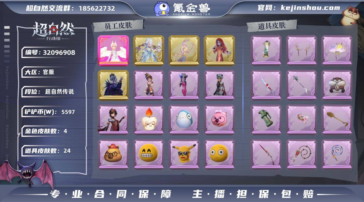 粉皮1;金皮4;紫皮4;道具皮24;皮肤:小黄-炽天使,零-渡鸦公爵,巫铃儿-镜花辞,逍遥-莲华渡,莉莉-瑶台梦,阿念-庆宴绮愿,爱丽丝-耀眼的你,艾伦-黎明猎手,薇薇安-仙锋小姐;道具:葫芦-伏妖塔,腰包-红运福虎,腰包-惊魂娃娃,桃木剑-凤鸣九天,铲子-龙鳞,折扇-赴此良宵,铲子-撒拉弗的祷告,传送按钮-浮生一梦,长鞭-飞天绫,额外的背包-飞花令,夜视仪-敛花容,长枪-波塞冬,刺刀-铂刺与红萼,夜视仪-金丝眼镜,传送按钮-昆仑镜,黄牛能量饮料-青玉抱丹,音响-happy猫,电击枪-甜蜜泡泡枪,长鞭-缚誓之锁,急救包-蔷薇物语,闪光弹-金戈玄铜,短管猎枪-赞萌露比水枪,摸金符-紫霄,急救包-土拨鼠捏捏;美妆:美妆-天使之泪,美妆-暗夜小恶魔;饰品:头饰-哈士奇头套,头饰-马上有钱,头饰-呆滞头套,头饰-面具马头套,头饰-嘻嘻头套,头饰-卑微头套,头饰-精致露比头套,头饰-小财神豚豚头套,头饰-太空鲨头套,头饰-烈焰红唇头套,头饰-滑稽头套,头饰-饺饺者头套,头饰-鱼头怪头套,头饰-萨卡班甲鱼头套,头饰-蒜了八,头饰-烛光纪念,头饰-像素朋克墨镜,头饰-后室幸存者头套,挂饰-钗头凤,挂饰-晚安小熊,挂饰-拂云仙,挂饰-糖果守卫,挂饰-九色祥鹿,背饰-梵音莲华,背饰-牛啤背包,背饰-蝶恋花,背饰-炽天使的余烬,背饰-白鼬趴趴,背饰-醉花阴;主页装扮:主页装扮-虚镜回廊,主页装扮-樱落金笺;动作:动作-不孬摇,动作-鸳鸯戏,动作-七仔摇,动作-知世摇,动作-舞台中心,动作-孤身摇,动作-新年摇,动作-金城舞,动作-鹏友摇,动作-老鼠舞,动作-抖肩舞,动作-举牌,动作-蝴蝶步,动作-拜年,动作-抬手;工牌背景:工牌背景-卷珠帘,工牌背景-珊瑚海,工牌背景-甜心的囚笼,工牌背景-流金照庭,工牌背景-复活的肖像,工牌背景-心同野鹤,工牌背景-永恒之阶,工牌背景-粉嫩小海狸,工牌背景-鸢尾花;工牌动作:工牌动作-蜕变,工牌动作-轻躯鹤立,工牌动作-净禅,工牌动作-鸦影;员工...