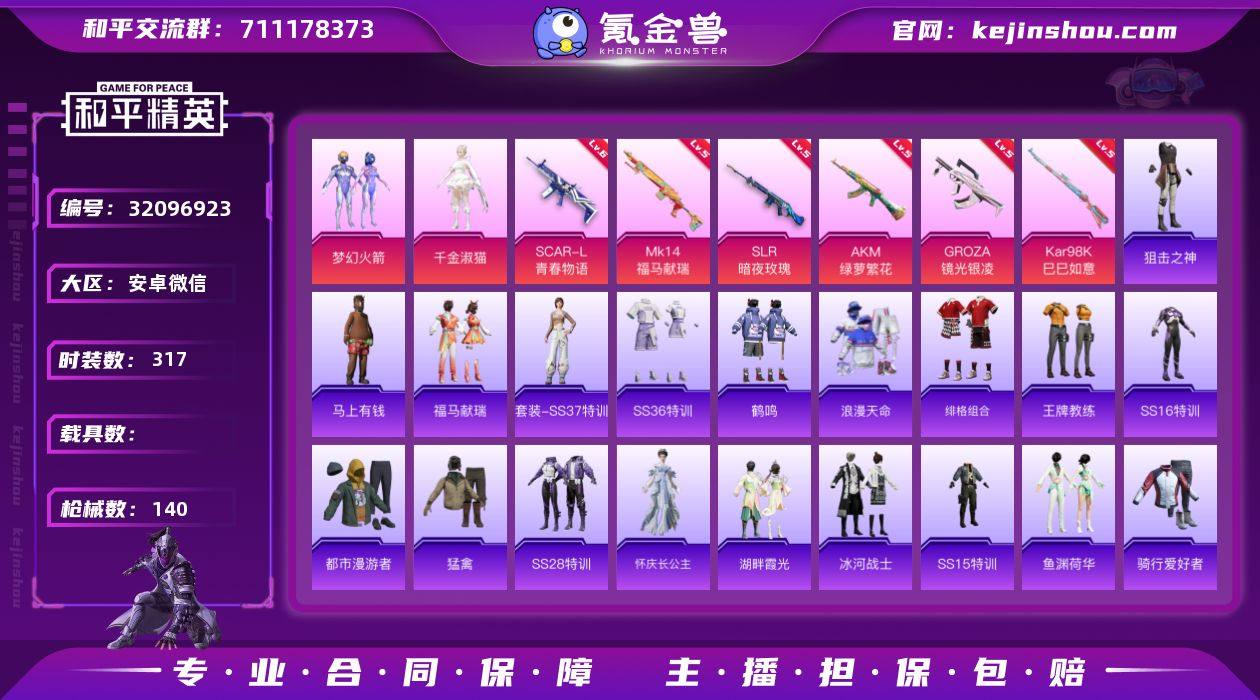 实名:可二次实名 是否支持人脸包赔:不支持 粉装数量:2 特效枪数量:6 时装数:317 枪械数:140 梦幻火箭,千金淑猫 六级SCAR-L-青春物语,五级MK14-福马献瑞,五级AKM-绿萝繁花,五级GROZA-镜光银凌,五级Kar98K-巳巳如意,五级SLR-暗夜玫瑰 狙击之神,马上有钱,福马献瑞,SS37特训,SS36特训,暗黑骑手,冰冻风暴,滨海假日,冰河战士,雏菊兔兔,长空猛禽,潮流炫酷,纯真浪花,蝶变,都市丽猫,都市漫游者,绯格组合,粉日山川,福星高照,幻彩翩翩,海岛探路者,鹤鸣,虎虎生威吉莉,湖畔霞光,怀庆长公主,海上生明月,黄色运动,惊鸿侠骨,竞技名士,吉莉礼服,街头风暴,锦衣飞扬,空岛之星,空投萌叽,龙的传人,萝兰蝴蝶,浪漫天命,猛禽,妙红点点,棉花软糖,魅力单车,萌趣颜团子,明鸳圣池,柠萌假日,破蛋小黄鸡,青蛇行歌,青团波波,骑行爱好者,瑞龙福将,热情海星,深海梦境,森林游猎者,SS14特训,SS15特训,SS16特训,SS17特训,SS18特训,SS19特训,SS23特训,SS24特训,SS25特训,SS26特训,SS28特训,SS29特训,SS30特训套装,SS31特训套装,巳巳如意,甜蜜告白,糖糖葫芦,团圆交子,王牌教练,醒狮腾龙,香桃花海,星途旅人,鱼渊荷华,燕燕于飞,战地菁英,智谋强哥,灼焰舞者 拂晓神骑飞行器,创世·救赎降落伞,鬼刀降落伞,梦幻火箭降落伞,千金淑猫降落伞,天之羽翼降落伞,未来歌姬降落伞