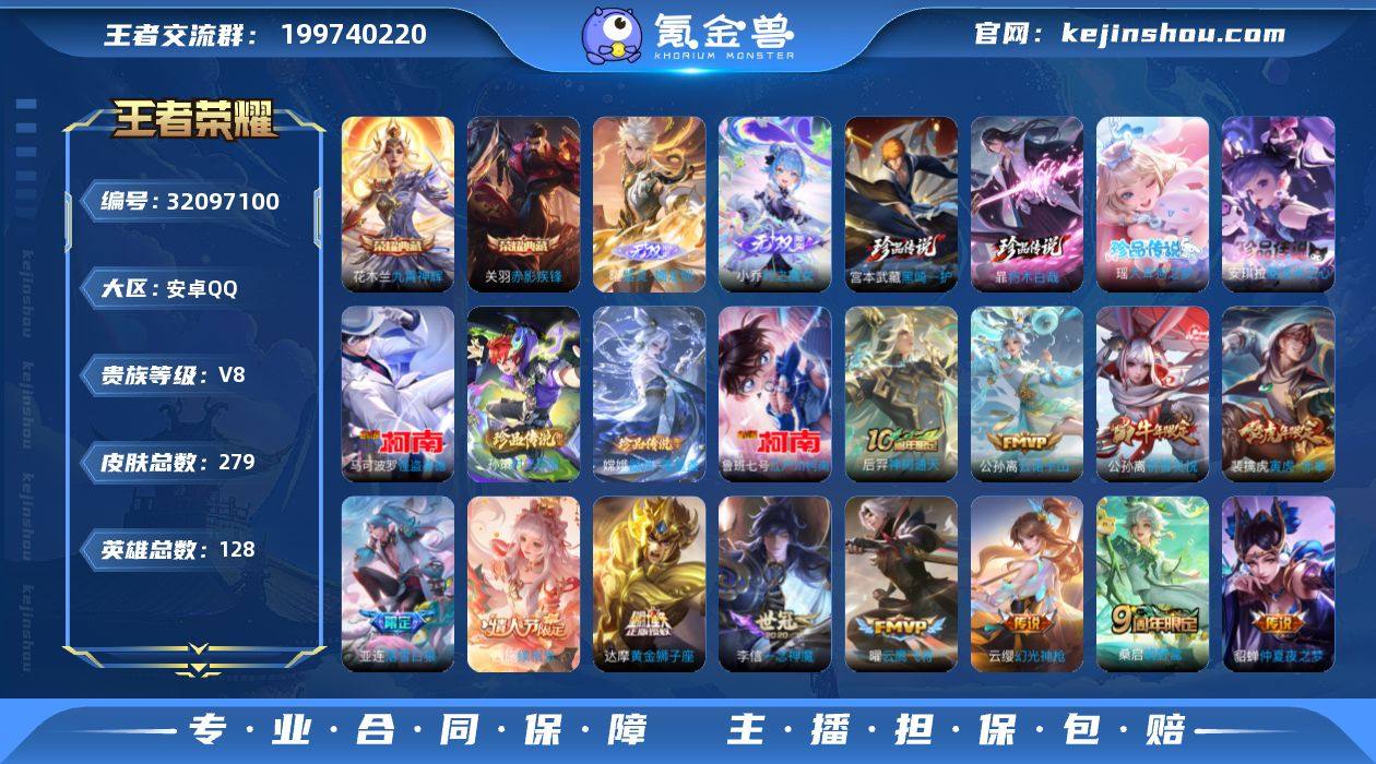 【mwz225】安卓Q-V8-最强王者段位-128英雄-279皮肤-2典藏皮肤-2无双-8珍品传说-21传说-85史诗 【英雄全皮】:孙权全皮,空空儿全皮,影全皮,少司缘全皮 【荣耀典藏】:花木兰九霄神辉,关羽赤影疾锋 【无双皮肤】:曜器灵螭龙剑,小乔时之魔女 【珍品传说】:宫本武藏黑崎一护,暃朽木白哉,安琪拉酷洛米之心,瑶大耳狗之梦,嫦娥器灵落星盏,孙策时之奇旅,鲁班七号江户川柯南,马可波罗怪盗基德 【传说皮肤】:后羿神树通天,公孙离云诺千山,西施续相思,云缨幻光神枪,嬴政玄雷天君,桑启鸣野蒿,海月金乌负日,亚连落雪白狼,百里守约碎云,蔡文姬花朝如约,裴擒虎寅虎赤拳,鲁班七号寅虎瑞焰,赵云淬星耀世,王昭君乞巧织情,公孙离祈雪灵祝,虞姬启明星使,曜云鹰飞将,李信一念神魔,干将莫邪久胜战神,达摩黄金狮子座,貂蝉仲夏夜之梦 【限定皮肤】:暃埋骨钱,蒙犽顽岩魄,蔡文姬夏日便利店,虞姬夏日便利店,姜子牙天穹之誓,杨戬破阵退雄兵,李白谪仙醉月,狄仁杰阴阳师,廉颇寅虎御盾,赵云皇家上将,赵云引擎之心,赵云龙胆,孙尚香蔷薇恋人,鲁班七号寅虎瑞焰,孙膑寅虎展翼,元歌云间偶戏,元歌无心,甄姬落雪兰心,狄仁杰魔术师,达摩沙漠行僧,项羽海滩派对,貂蝉逐梦之音,安琪拉魔法小厨娘,孙悟空至尊宝,虞姬启明星使,杨玉环寅虎心曲,雅典娜黎明之约,百里玄策原初追逐者,公孙离祈雪灵祝,裴擒虎寅虎赤拳,裴擒虎擒涛扼浪,米莱狄胡桃异想国,猪八戒西部大镖客,上官婉儿梁祝,西施玲珑珍味,西施至美乘鲤谣,鲁班大师探海日志,艾琳女武神,艾琳流音漫舞,阿古朵江河有灵,张良古海寻踪,妲己灵卜魔法,鬼谷子天穹祈灯,伽罗琥珀纪元,小乔时之魔女,亚连落雪白狼,海月金乌负日,刘邦剑破天穹,程咬金群星魔术团,镜青焰无极,项羽苍威无极,芈月浮光幕影,周瑜熔金海岸 【年限皮肤】...