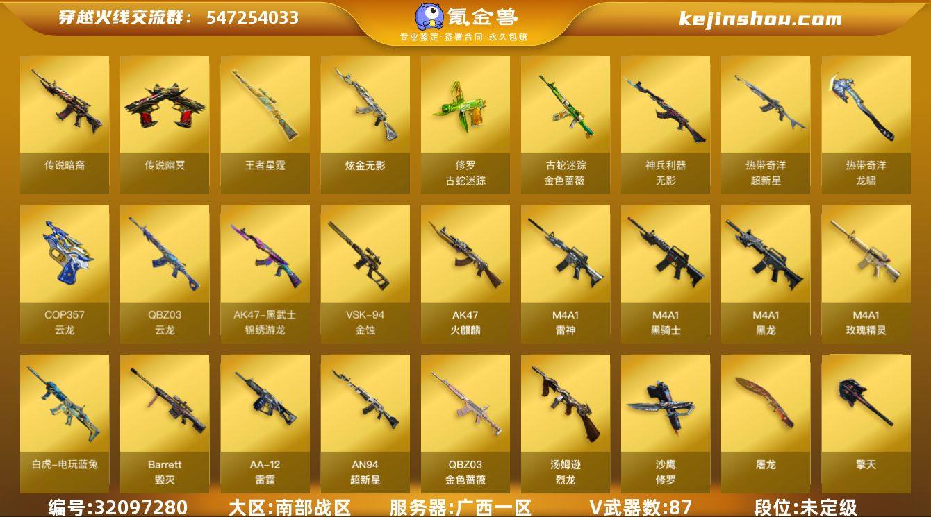 广西一区-107V-21王者武器数-1炫金武器数 【传说武器】:传说暗裔,传说幽冥 【热门武器】:传说暗裔,传说幽冥,QBZ03-金色蔷薇,金色蔷薇-古蛇迷踪,修罗-古蛇迷踪,死亡之眼,白虎-电玩蓝兔*2,荣耀世冠-柯尔特,C.A.T,M4A1-黑骑士*3,汤姆逊-烈龙*2,加特林-炼狱,沙鹰-修罗*6,炽芒蝶刃*2 【王者炫金武器】:王者星霆,炫金无影,王者之魄高爆手雷 【音效卡】:M4A1-黑骑士音效卡,枪娘语音包-阿敏,Barrett-碧霄极光音效卡,炼狱-百战金芒-庆典舞曲音效卡 【皮肤】:金色蔷薇-枪娘阿敏 皮肤,金色蔷薇-破浪逐光 皮肤,金色蔷薇-电竞之星 皮肤,裁决-流光秘银,雷神-耀金皮肤,雷神-宇航兔皮肤,雷神-梦蝶 皮肤,雷神-源计划2.0专属 皮肤,雷神-化蛇 皮肤,M4A1-再燃火线,火麒麟-雷神,火麒麟-轻羽皮肤,火麒麟-平天大圣,火麒麟-巅峰荣耀,火麒麟-心动糖果,毁灭-SV-CFPLS16冠军,毁灭-黑大圣皮肤,毁灭-风暴,毁灭-黑曼巴 皮肤,毁灭-百城浙江 皮肤,毁灭-虹光风暴 皮肤,毁灭-梦蝶 皮肤,毁灭-秦师 皮肤,毁灭-英雄计划 皮肤,M4A1-千变-孔明皮肤,黑龙-能量核心,黑骑士-冠军之势,黑骑士-破浪10年皮肤,黑骑士-破界 皮肤,玫瑰精灵-粉色浪漫 皮肤,AK47-B-常胜将军-曹操,修罗-能量核心*2,修罗-星空,修罗-百战金芒 皮肤,屠龙-星火燎原,屠龙-破浪逐光 皮肤,轻型军用手斧-再燃火线 【角色】:枪娘樱,机械姬,司雨,零·纪元,王者葵-惊若翩鸿,王者玲珑,雪域霜狐,蛇隐宗,奇洋探员,乔伊教练,修道士,云海玲珑,葵-阿尔法武装,幻面灵狐,炽天使,暗夜-X,电竞少女,飞虎队-X,虎妞,嘉年华灵狐,娟娟,猎狐者-追月,0号玩家,灵狐-花神,灵狐者-X,龙儿,麻雀,曼陀罗-X,萌儿,潘多拉-甜心教官,蛇姬,斯沃特-X,铁骑荣耀,兔囡囡,维纳斯,新娜塔莎,雪莉杨,雪莉杨-摸金校尉,夜玫瑰-幻能朋...