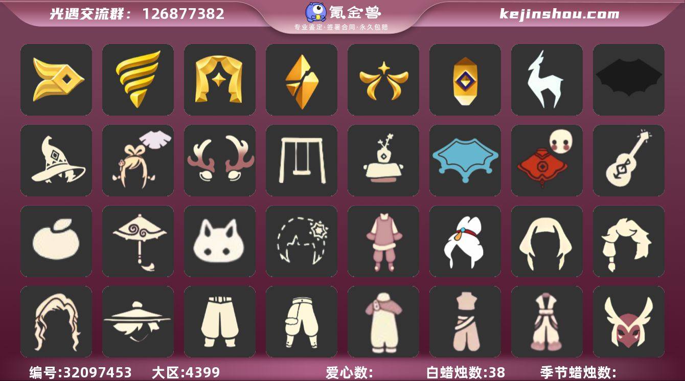 VIVO 手机账号 2珍稀物品 7毕业季 6毕业图 38蜡烛 【珍稀物品】白枭(帝企鹅发),透明蝶翼斗 【季节已毕业】风行季,潜海季,表演季,破晓季,欧若拉季(欧若拉),追忆季,九色鹿(九色鹿季) 【完成地图】晨岛,云野,雨林,霞谷,墓土(暮土),禁阁 【礼包】新年裤(瑞气服饰),巫师(巫师帽),绊爱(绊爱斗篷)(绊爱礼包),橘子(大橘大利),雪花(雪花发夹),兔子(玉兔头饰)(玉兔发饰)(兔子发饰),鹿角(圣诞鹿角),福娃(福娃礼包)(春之日礼包)(铜钱斗),蝙蝠套(蝙蝠斗篷)(南瓜头),瑞雪(瑞雪斗篷)(暖冬瑞雪),吉他(音韵吉他)(白吉他),红伞(瑞气纸伞),秋千(情人秋千),茶桌(花憩茶桌) 【裤子】飞天裤(柔缎花边连)(九色鹿丝带裤),蓝绿裤(高领舞服),武士裤,背带裤,搓澡巾 【面具】黄眉企鹅面具,夜行毕业面具(棕熊面具),呼吸面具(潜水面具) 【面饰】红耳机 【项链】围巾(肩带) 【发型】单侧绑发(单边小辫),留辫蘑菇头,飞天盘发(九色鹿丸子头),虚荣,若笠(箬笠) 【头饰】平顶帽,蓝色音乐会(蓝色音乐符),羽毛发饰(多羽发饰) 【斗篷】冥龙斗篷,燕尾斗篷,遥鲲斗篷(双翼遥鲲斗),海洋斗 【配饰】鲲灯(追忆之书),雨伞,高音钢琴(白色高脚钢琴)
