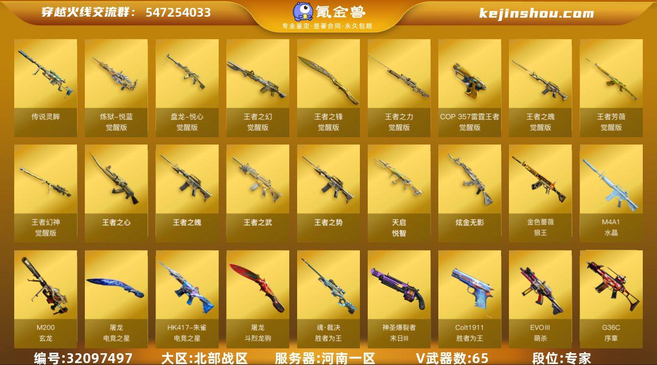 实名:可二次实名 段位:专家 VIP等级:VIP6 V武器数:65 王者武器数:14 CF点:14 传说灵眸 Colt1911-胜者为王,EVOⅢ-萌杀,G36C-序章,魂·裁决-胜者为王,HK417-朱雀-电竞之星,金色蔷薇-狼王,M200-玄龙,M4A1-水晶,M4A1-再燃火线,神圣爆裂者-末日III,屠龙-电竞之星,屠龙-斗烈龙驹,丛林匕首-玄豹,USP-冥王,机械迷城-穹宇,死神-雪域霜狐,M4A1-赤狱骑士,AWM-昌龙,玫瑰精灵-蓝调梦幻,雷霆之锋,无影-神兵利器,AK47-B-身先士卒,USP-小动物,QBZ03-云龙,AK47-火麒麟,AK47-黑武士,M4A1-雷神,M4A1-黑骑士,M4A1-死神,M4A1-黑龙,M4A1-玫瑰精灵,M200-幻神,Barrett-毁灭,Barrett-极光,AWM-天龙,Kar98k-星神,AA-12-雷霆,AK12-天启,AN94-超新星,QBZ03-金色蔷薇,Scar Light-白虎,9A91-烈火,屠龙,龙啸,麒麟刺,擎天,M200-竞技荣光,柯尔特-竞技荣光,USP-雷暴,擎天-竞技荣光,龙啸-荣耀世冠,AK47-B-常胜将军,Barrett-暗月传说,幻灵之锋,AK47-B-战士,AK47-B-战神,AK-47-猩红传说,裁决,天神,柯尔特-冠军之特,G36C-幻影,修罗-云海游龙,擎天-云海游龙,M4A1-苍鸣雷神,Barrett-碧霄极光 炼狱-悦蓝-觉醒版,盘龙-悦心-觉醒版,王者之幻-觉醒版,王者之锋-觉醒版,王者之力-觉醒版,COP 357-雷霆王者-觉醒版,王者之魄-觉醒版,王者芳薇-觉醒版,王者幻神-觉醒版,王者之心,王者之魄,王者之武,王者之势,天启-悦智 HK417-朱雀-电竞之星-竞星跃动音效卡,屠龙-电竞之星-竞星跃动音效卡,死神-雪域霜狐-怀旧音效卡,云海游龙音效卡,加特林-炼狱音效卡,M200-幻神音效卡,AWM-裁决音效卡,M4A1-黑骑士音效卡,Barrett-极光音效卡,Barrett-毁灭音效卡,AK47-火麒麟音效卡 炫金无影 黄金猫猫手套-白鲨,异变清道夫-蛇影双骄,冰火魔兽,魔能飞环-曼陀罗,迷你深渊冰龙-王绿豆,萌兔-斯泰尔,火麒麟-绝迹,天龙-曼陀罗,M37-葵,COP-旗袍,猫猫手套 卖家说:幻神3件套,满副武器,传说星骇,冠军之特,3冠军之刃,裁决音效卡,qbz音效卡,极光,毁灭音效卡