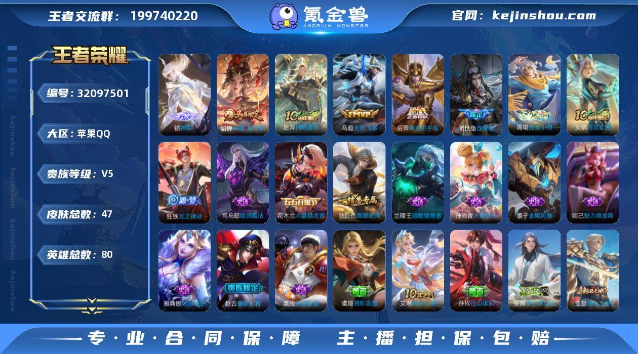 【单无双小号·神罪·貂蝉神骥聚万邦·无双飞将】苹果Q-V5-至尊星耀II段位-80英雄-47皮肤-1无双-4传说-13史诗 【英雄全皮】:孙权全皮 【无双皮肤】:铠神罪 【传说皮肤】:貂蝉神骥聚万邦,后羿神树通天,马超无双飞将,后羿黄金射手座 【限定皮肤】:狄仁杰阴阳师,赵云皇家上将,项羽海滩派对 【赛季限定】:钟馗虚灵犬护,甄姬逆浪荇歌,亚瑟荣光之誓 【战令限定】:周瑜线条小狗 【史诗皮肤】:明世隐百晓客,周瑜线条小狗,女娲万灵启世,狂铁龙之律动,司马懿暗渊魔法,狄仁杰鹰眼统帅,雅典娜冰冠公主,兰陵王暗隐猎兽者,花木兰水晶猎龙者,墨子金属风暴,妲己魅力维加斯,嬴政摇滚巨星,孙尚香水果甜心,赵云皇家上将 【其他皮肤】:虞姬溯影追猎,艾琳鹤鸣心笺,孙权径山谋武,张良罗小黑战记,亚瑟荣光之誓,哪吒罗小黑战记,甄姬逆浪荇歌,露娜命运加冕,张良灵野札记,钟馗虚灵犬护,吕布野性能量,苏烈坚韧之力,刘备纽约教父,狄仁杰阴阳师,后羿阿尔法小队,亚瑟死亡骑士,典韦黄金武士,姜子牙时尚教父,孙膑天使之翼,芈月红桃皇后,赵云忍炎影,项羽海滩派对,百里守约绝影神枪,黄忠芝加哥教父,诸葛亮星航指挥官,马可波罗激情绿茵,李白范海辛,曹操超能战警 【营地ID】:1570996298