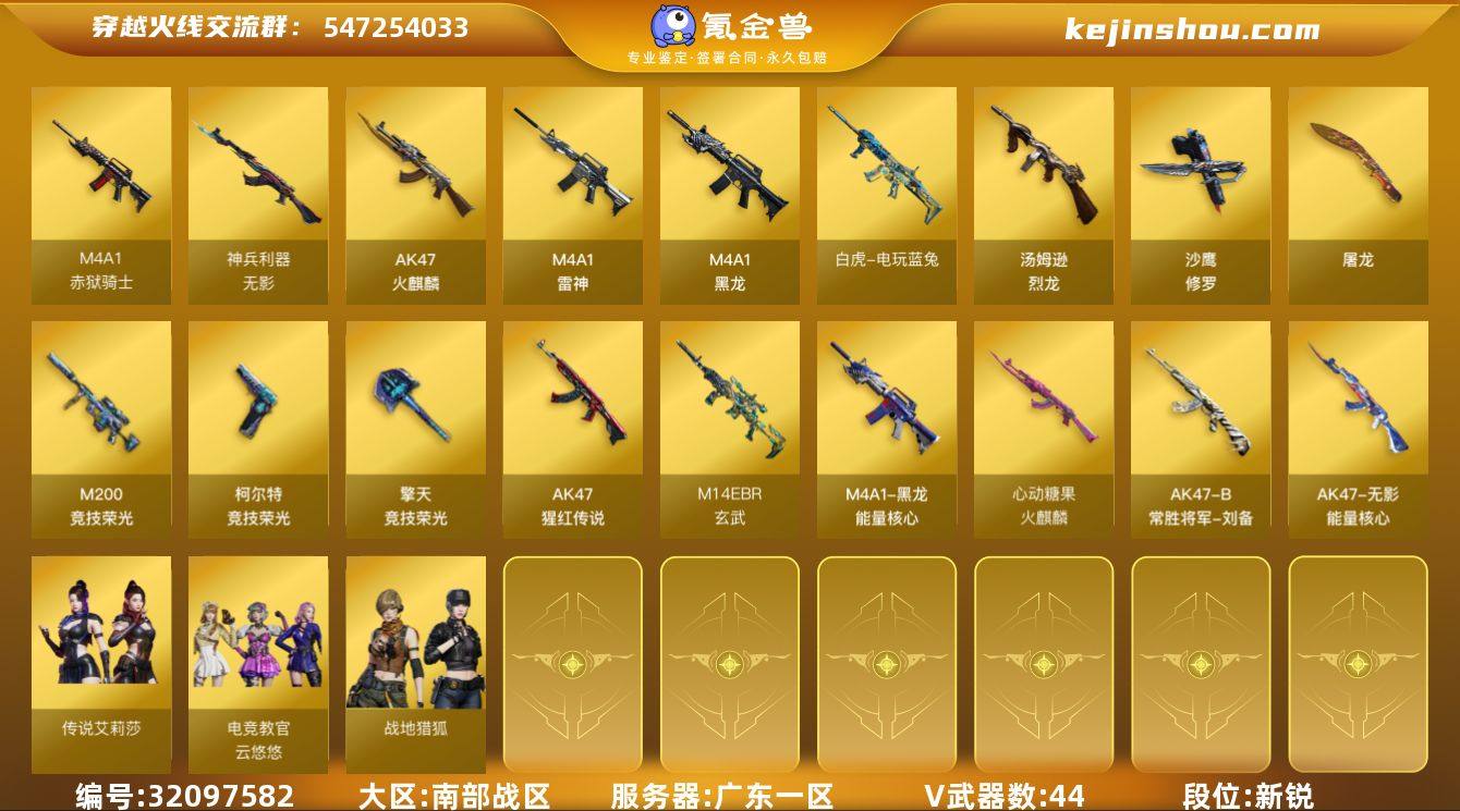 广东一区-48V-0王者武器数-0炫金武器数 【传说角色】:传说艾莉莎 【热门武器】:M14EBR-玄武,M200-竞技荣光,死亡之眼,白虎-电玩蓝兔,牛牛-AK47,汤姆逊-烈龙*6,毁灭-孙三炮,沙鹰-修罗,金刚伞 【皮肤】:火麒麟-心动糖果,黑龙-能量核心,无影-能量核心,AK47-B-常胜将军-刘备,屠龙-破浪逐光 皮肤 【角色】:电竞教官-云悠悠,战地猎狐,暗夜-X,初恋灵狐,芳心审判者,虎妞,嘉年华灵狐,灵狐者-X,灵狐者-黄金海岸,龙儿,麻雀,潘多拉-X,青霞仙子,斯沃特-X,蜀雪 【人偶武器】:毁灭-孙三炮,M4A1-雷神-精英刀锋,AWM-灵狐-15周年嘉年华,牛牛-AK47,迷你深渊冰龙,迷你波特博士,夺魂,迷你火种,迷你生化手雷,生化手雷-机甲核心,深渊终结者手雷,迷你超能女侍 【暴走生化】:死亡之眼,超级对讲机 【挑战大师】:冰龙粉碎者-白马银枪,激光毁灭者III,试炼破坏者III,KAC-圣炎切割者III,神圣爆裂者-末日III 【英雄级武器】:AK47-火麒麟*2,M4A1-黑龙,M4A1-雷神,M14EBR-玄武,无影-神兵利器,AK-47-猩红传说,白虎-电玩蓝兔,M200-竞技荣光,汤姆逊-烈龙*6,沙鹰-修罗,COP-雷霆,柯尔特-竞技荣光,屠龙,擎天-竞技荣光,高爆手雷-竞技荣光*7,闪光弹-竞技荣光*7,烟雾弹-竞技荣光*7,M4A1-赤狱骑士 【道具】:云山科技背包,亚洲杯纪念炫彩背包,全能枪王背包,战舰背包,次元之矛-黄金背包,虎牙炫彩背包,救世主-黑桃战神,黄金生化钩,绿色巨人,灵魂忍者,变异宝贝,迷雾幽灵,夺命之镰,防化服*3,金色流光-枪王排位*2,星辰流光-枪王排位,电玩兔兔表情,防弹头盔*4,防弹衣*4,C4工具钳*4,手雷包*4 【特殊枪械】:6烈龙