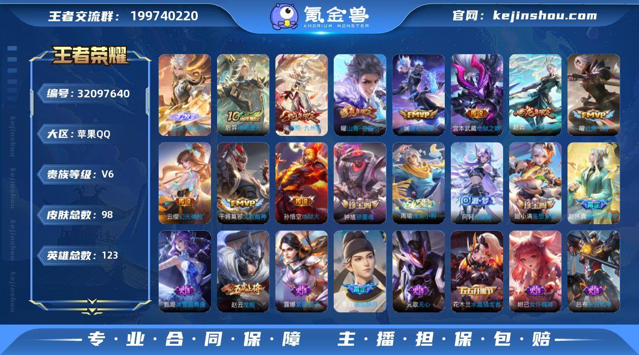 实名: 可修改 性别: 男号 贵族等级: V6 英雄数: 123 皮肤数: 98 无双皮: 器灵·螭龙剑 传说皮: 云鹰飞将,久胜战神,地狱火,地狱之眼,山海·苍雷引,澜逐花归海,乘龙·铭钟鼎,幻光神枪,神树通天 限定皮: 龙胆,愿照·九州拓 亮点: 【优质装备】:器灵·螭龙剑,云鹰飞将(小将军),久胜战神,地狱火,地狱之眼,山海·苍雷引(电光曜子),澜逐花归海