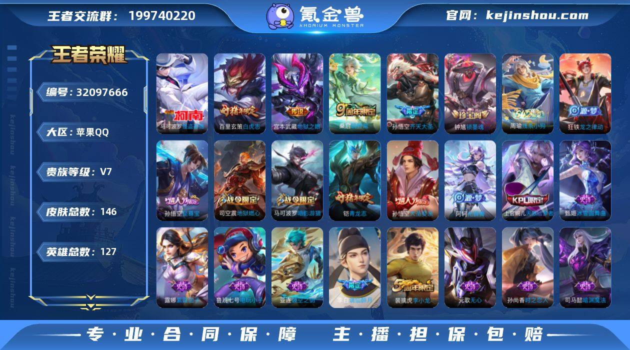 实名: 可修改 性别: 男号 贵族等级: V7 英雄数: 127 皮肤数: 146 珍品传说: 怪盗基德 传说皮: 地狱之眼 限定皮: 李小龙,逐梦之影,天狼绘梦者,白虎志,青龙志,瑞麟志,至尊宝,大圣娶亲,齐天大圣,鸣野蒿,逐霄战戟 亮点: 【优质装备】:怪盗基德,地狱之眼