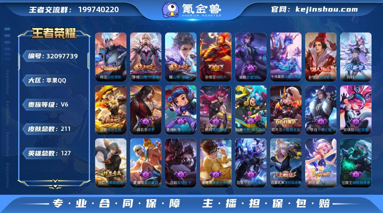127英雄 211皮肤 可修改实名 男号 【英雄全皮】孙权全皮,大禹全皮 【稀有英雄】大司命,嬴政(始皇帝),韩信(韩跳跳),夏洛特(夏师傅),艾琳,橘右京(橘子),娜可露露(鸟人),不知火舞,赵云,金蝉(唐僧),戈娅 【荣耀水晶】弑枪猎影(韩信典藏) 【传说皮】山海·炽霜斩(李信年限),地狱火,山海·苍雷引(电光曜子) 【珍宝阁皮】妄想食味,女武神,玩趣恶龙 【赛季/战令皮】噬灭天穹(s37),古海寻踪(s33),海盐诗旅(s30),擒涛扼浪(s31),探海日志(s32),顽趣-梦奇,天穹祈灯(s34),凯尔特女王(s7),狰(s8),饕餮(s9),烛龙(s10),重明(s11),穷奇(s12),御狮(s13),御霄(s14),御旌(s15),御銮(s16),朔风刀(s17),混沌棋(s18),疑决卦(s19),醍醐杖(s20),原初探秘者(s21),万华元夜(s22),演武夺筹(s23),驱傩正仪(s24),千军破阵(s25),猎兽之王,白昼王子,沙漠行僧(s26),金庭之子(s27),大漠名商(s28),云中旅人(s29) 【史诗皮】星界战将,化蝶舞,九幽镇关,万灵启世,涂山容容,灵蛊蚀心,百相守梦-黄忠,紫霞仙子,电玩小子(小书包),黄金分割率,特工魅影,千年之狐,江河有灵,蒙恬荣光圣徽,偶像歌手,暗夜猫娘,电玩·爆裂旋风,猫狗日记-孙策,乱世虎臣,节奏热浪,修罗,摇滚巨星,水果甜心,天才门将,星夜王子,心灵骇客,功夫厨神,德古拉伯爵,暗隐猎兽者,鬼剑武藏,缤纷独角兽,乘风破浪,逐浪之夏,水晶猎龙者,金属风暴,原初追逐者,圣诞狂欢,圣诞恋歌,鹰眼统帅,黎明之约,无心 【限定皮】凤求凰(白切鸡),遇见飞天,高山流水,五谷丰年,冰锋战神,游园惊梦,梁祝,李小龙,辉光之辰,大圣娶亲,冰霜恋舞曲 【普通皮】谧流熔炉,雪境奇遇-西施,星梦巡礼,劲辣红锅,功夫炙烤,街头霸王,龙舞盛年,暗都幽影,虚灵犬护,荣光之誓,径山谋武,鹤鸣心笺,逐霄之志,罗小黑战记-哪吒,克喵,灵野札记,布丁狗之约,踏浪烽翎,锦麟游梦,逆浪荇歌,死霸装,聚星
