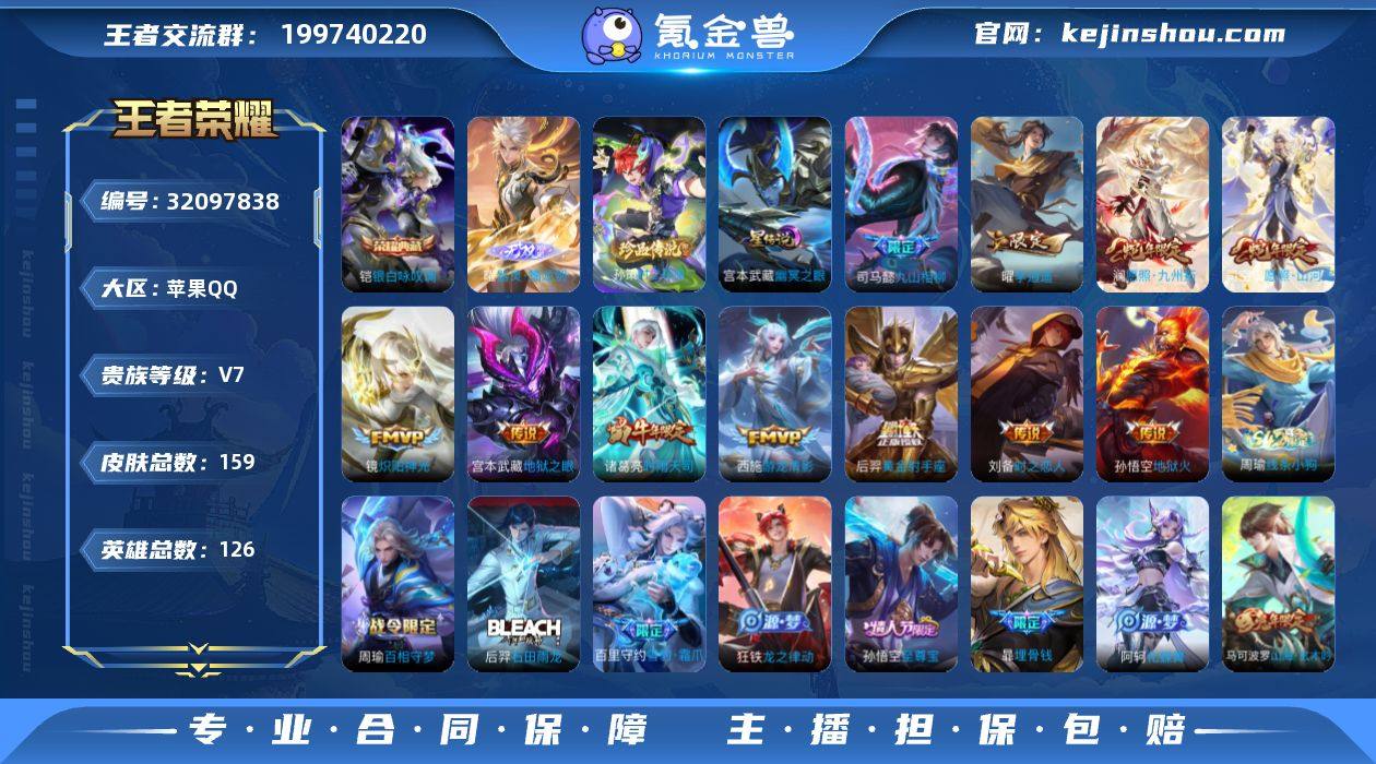 苹果Q-V7-最强王者段位-126英雄-159皮肤-1典藏皮肤-1无双-1珍品传说-13传说-50史诗【荣耀典藏】:铠银白咏叹调【无双皮肤】:曜器灵螭龙剑【珍品传说】:孙策时之奇旅【传说皮肤】:关羽神骥镇沧海,马超神骥逐星野,司马懿九山相柳,司空震愿照山河定,澜愿照九州拓,西施游龙清影,曜李逍遥 ,诸葛亮时雨天司,镜炽阳神光,刘备时之恋人,后羿黄金射手座,宫本武藏地狱之眼,孙悟空地狱火【限定皮肤】:暃埋骨钱,蔡文姬夏日便利店,虞姬夏日便利店,姜子牙天穹之誓,李白谪仙醉月,狄仁杰阴阳师,赵云皇家上将,墨子神迹守卫,鲁班七号乒乒小将,高渐离玩趣恶龙,元歌云间偶戏,马可波罗逐梦之星,马可波罗山海玄木吟,狄仁杰魔术师,狄仁杰万华元夜,达摩星际陆战队,达摩沙漠行僧,项羽海滩派对,老夫子航海奇遇记,程咬金演武夺筹,韩信逐梦之影,韩信飞衡,韩信傲雪梅枪,亚瑟潮玩骑士王,孙悟空至尊宝,钟馗驱傩正仪,鬼谷子原初探秘者,诸葛亮时雨天司,沈梦溪大漠名商,米莱狄胡桃异想国,伽罗天狼溯光者,曜李逍遥 ,周瑜熔金海岸【年限皮肤】:韩信飞衡,诸葛亮时雨天司,马可波罗山海玄木吟,司空震愿照山河定,澜愿照九州拓【赛季限定】:鬼谷子原初探秘者,狄仁杰万华元夜,程咬金演武夺筹,钟馗驱傩正仪,达摩沙漠行僧,沈梦溪大漠名商,姜子牙天穹之誓,太乙真人谧流熔炉,钟馗虚灵犬护,甄姬逆浪荇歌【战令限定】:元歌云间偶戏,亚瑟潮玩骑士王,米莱狄胡桃异想国,达摩星际陆战队,老夫子航海奇遇记,墨子神迹守卫,蔡文姬夏日便利店,虞姬夏日便利店,孙悟空神迹守卫,孙膑茶境仙,马超访茗客,周瑜百相守梦,孙策百相守梦,周瑜线条小狗【史诗皮肤】:周瑜线条小狗,周瑜百相守梦,后羿石田雨龙,百里守约雪豹霜爪,狂铁龙之律动,阿轲化蝶舞,狄仁杰绮世丹青,赵怀真器灵浮梦炉,孙膑茶境...
