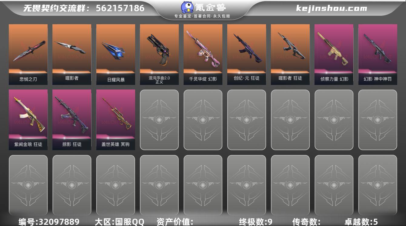 【qyz9126】威龙套精品号 qyz9126 【近战武器】:近战武器-威龙之刃,近战武器-钢轨卫士 战锤 【狂徒】:狂徒-混沌序曲,狂徒-塑水宗,狂徒-盖亚的复仇,狂徒-耀鳞威龙,狂徒-钢轨卫士 【幻影】:幻影-般若假面,幻影-侦察力量,幻影-战术小伙伴 【戍卫】:戍卫-钢轨卫士 【獠犬】:獠犬-战术小伙伴 【冥驹】:冥驹-偃月苍龙,冥驹-堕天遗武 【飞将】:飞将-光导纤维 【奥丁】:奥丁-战术小伙伴 【骇灵】:骇灵-塑水宗,骇灵-光导纤维 【蜂刺】:蜂刺-战术小伙伴 【标配】:标配-光导纤维 【正义】:正义-复古浪潮,正义-纳米打击 【鬼魅】:鬼魅-耀鳞威龙,鬼魅-光导纤维 【狂怒】:狂怒-钢轨卫士 【短炮】:短炮-钢轨卫士 【卡面】:终章:激斗汉堡 卡面,进入射程 卡面,《双城之战》拥抱 卡面,精灵大战 卡面,欢迎来到底城 卡面,南瓜盛典 卡面,VCT CN首冠 卡面,修车达人 卡面,热舞环节 卡面,正义的化身 卡面,梦幻奶茶 卡面,源能反应 卡面,零点嗅探设计图 卡面,表象之下 卡面,沙雕爆能器 卡面,无畏契约GO!第一卷:芮娜 卡面,清除名单 卡面,无畏契约GO!第一卷:零 卡面,龍记 卡面,化茧成蝶 卡面,比比看谁快? 卡面,《双城之战》金克丝 卡面,蝰蛇vs幽影 卡面,势不可挡//盖可 卡面,逆向独行 卡面 ,同步耍酷 卡面,完美调谐 卡面 ,没有什么能逃过我的眼睛 卡面,光导纤维 卡面,战术小伙伴 卡面,钢轨卫士 卡面,暗枪 卡面,夯实根基 卡面,铁臂设计图 卡面,代号红色 卡面,冰淇淋店 卡面,新兵报到 卡面,友军火力 卡面,V契约 卡面,无畏契约 卡面 【喷漆】:嗨宝南瓜灯 喷漆,啊? 喷漆,嘭! 喷漆,都算到了 喷漆,控场勿近 喷漆,熊抱 喷漆,蛋糕还是爆能器? 喷漆,捷风差距 喷漆,我觉得不行 喷漆,我的刀呢? 喷漆,UWU 喷漆,新潮流 喷漆,双击点赞 喷漆,买装还是存钱 喷漆...