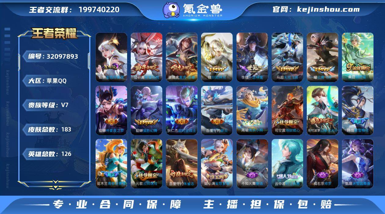 苹果Q-V7-永恒钻石III段位-126英雄-183皮肤-11传说-54史诗【传说皮肤】:桑启鸣野蒿,百里守约碎云,马超无双飞将,裴擒虎寅虎赤拳,公孙离祈雪灵祝,镜炽阳神光,曜云鹰飞将,李信一念神魔,貂蝉猫影幻舞,貂蝉仲夏夜之梦,狄仁杰超时空战士 金色仲夏夜【限定皮肤】:蒙犽顽岩魄,姜子牙天穹之誓,狄仁杰阴阳师,赵云皇家上将,墨子神迹守卫,嬴政优雅恋人,周瑜真爱至上,元歌云间偶戏,元歌无心,马可波罗山海玄木吟,狄仁杰魔术师,狄仁杰万华元夜,达摩沙漠行僧,项羽海滩派对,老夫子醍醐杖,老夫子航海奇遇记,程咬金演武夺筹,韩信傲雪梅枪,王昭君午后时光,兰陵王金庭之子,花木兰青春决赛季,亚瑟潮玩骑士王,后羿圣弓游侠,李元芳云中旅人,钟馗驱傩正仪,干将莫邪真爱魔法,鬼谷子原初探秘者,鬼谷子五谷丰年,苏烈千军破阵,百里守约朱雀志,公孙离祈雪灵祝,沈梦溪大漠名商,裴擒虎李小龙,裴擒虎寅虎赤拳,裴擒虎擒涛扼浪,狂铁电玩高手,云中君时之祈愿,嫦娥拒霜思,鲁班大师探海日志,桑启海盐诗旅,艾琳流音漫舞,司空震地狱燃心,阿古朵江河有灵,张良古海寻踪,蒙恬荣光圣徽,鬼谷子天穹祈灯,姬小满妄想食味,沈梦溪龙舞盛年【年限皮肤】:百里守约朱雀志,公孙离祈雪灵祝,裴擒虎寅虎赤拳,马可波罗山海玄木吟【赛季限定】:老夫子醍醐杖,鬼谷子原初探秘者,狄仁杰万华元夜,程咬金演武夺筹,钟馗驱傩正仪,苏烈千军破阵,达摩沙漠行僧,兰陵王金庭之子,沈梦溪大漠名商,李元芳云中旅人,桑启海盐诗旅,裴擒虎擒涛扼浪,鲁班大师探海日志,张良古海寻踪,鬼谷子天穹祈灯,姜子牙天穹之誓,东皇太一噬灭天穹,甄姬逆浪荇歌,亚瑟荣光之誓,蒙恬荣光圣徽【战令限定】:元歌云间偶戏,亚瑟潮玩骑士王,老夫子航海奇遇记,墨子神迹守卫,干将莫邪真爱魔法,后羿圣弓游侠,狂铁电玩高手,王...