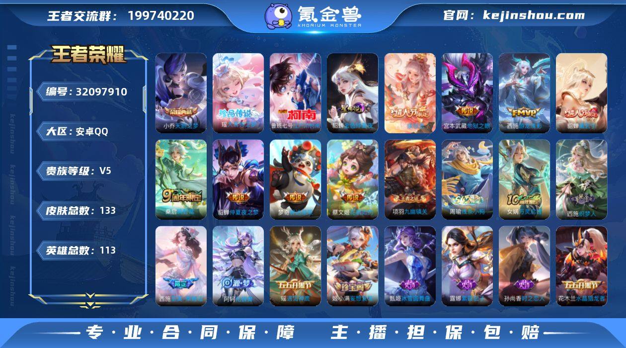 安卓Q-V0-至尊星耀II段位-113英雄-133皮肤-1典藏皮肤-2珍品传说-8传说-37史诗【英雄全皮】:西施全皮,空空儿全皮【荣耀典藏】:小乔天鹅之梦【珍品传说】:瑶大耳狗之梦,鲁班七号江户川柯南【传说皮肤】:西施续相思,桑启鸣野蒿,貂蝉曦玄引,蔡文姬花朝如约,西施游龙清影,梦奇胖达荣荣,貂蝉仲夏夜之梦,宫本武藏地狱之眼【限定皮肤】:蒙犽顽岩魄,大乔绒语心约,姜子牙天穹之誓,狄仁杰阴阳师,赵云皇家上将,项羽海滩派对,百里玄策原初追逐者,西施玲珑珍味,西施至美乘鲤谣,桑启海盐诗旅,鬼谷子天穹祈灯,姬小满妄想食味,貂蝉曦玄引,沈梦溪龙舞盛年,鲁班七号蔬乡物语,李元芳蔬乡物语,刘邦剑破天穹,程咬金群星魔术团,镜青焰无极,项羽苍威无极,周瑜熔金海岸【赛季限定】:桑启海盐诗旅,鬼谷子天穹祈灯,刘邦剑破天穹,姜子牙天穹之誓,东皇太一噬灭天穹,太乙真人谧流熔炉,钟馗虚灵犬护,甄姬逆浪荇歌,亚瑟荣光之誓,百里玄策原初追逐者,项羽九幽镇关【战令限定】:西施玲珑珍味,鲁班七号蔬乡物语,李元芳蔬乡物语,镜青焰无极,项羽苍威无极,周瑜线条小狗【史诗皮肤】:周瑜线条小狗,项羽九幽镇关,女娲万灵启世,百里玄策罗小黑战记,西施织梦人,阿轲化蝶舞,蒙犽顽岩魄,镜青焰无极,鲁班七号蔬乡物语,姬小满妄想食味,西施至美乘鲤谣,西施诗语江南,百里玄策原初追逐者,孙尚香时之恋人,瑶遇见神鹿,小乔青蛇,狄仁杰鹰眼统帅,大乔猫狗日记,孙策猫狗日记,阿轲节奏热浪,李元芳逐浪之夏,刘禅天才门将,蔡文姬舞动绿茵,百里守约特工魅影,安琪拉心灵骇客,雅典娜冰冠公主,亚瑟心灵战警,小乔缤纷独角兽,花木兰水晶猎龙者,妲己女仆咖啡,妲己魅力维加斯,嬴政摇滚巨星,孙尚香水果甜心,王昭君偶像歌手,甄姬冰雪圆舞曲,貂蝉圣诞恋歌,赵云皇家上将,露娜紫霞仙子【其他...