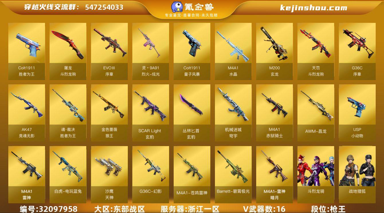实名:可二次实名 段位:枪王 VIP等级:VIP3 V武器数:16 CF点:1522 AK47-竞魂无影,Colt1911-量子风暴,Colt1911-胜者为王,EVOⅢ-序章,G36C-序章,魂·裁决-胜者为王,金色蔷薇-狼王,灵・9A91-烈火-炫光,M200-玄龙,M4A1-水晶,M4A1-再燃火线,天罚-斗烈龙驹,屠龙-斗烈龙驹,丛林匕首-玄豹,SCAR Light-玄豹,机械迷城-穹宇,M4A1-赤狱骑士,AWM-昌龙,USP-小动物,M4A1-雷神,白虎-电玩蓝兔,天神,G36C-幻影,M4A1-苍鸣雷神,Barrett-碧霄极光 超新星-枪娘安琪儿