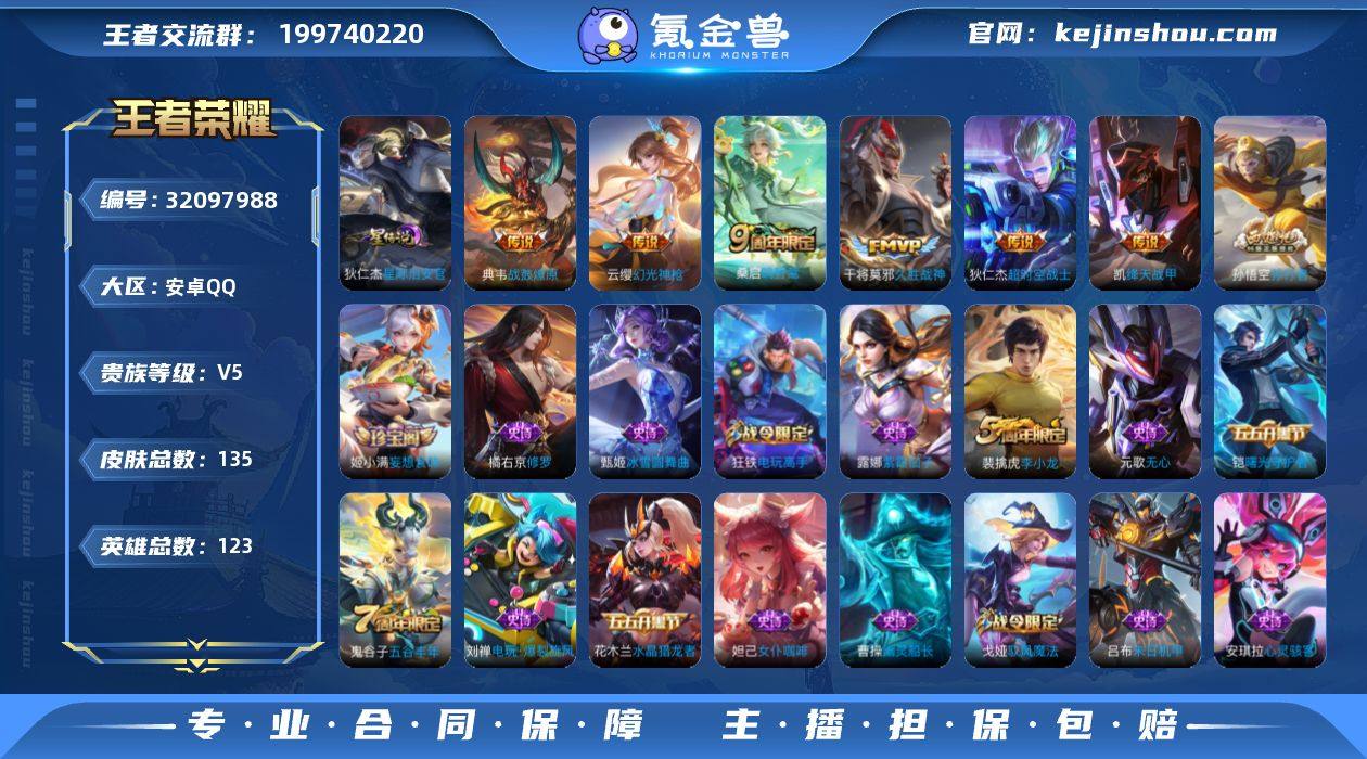 W13855,,可立即换绑无需挂单养号,,铭文满级,,传说6,,星传说1,,按键4,,,夺宝191,,安卓Q-V5-尊贵铂金II段位-123英雄-135皮肤-6传说-33史诗 【英雄全皮】:戈娅全皮 【传说皮肤】:云缨幻光神枪,桑启鸣野蒿,典韦战鼓燎原,铠绛天战甲,干将莫邪久胜战神,狄仁杰超时空战士 【限定皮肤】:狄仁杰阴阳师,赵云皇家上将,孙尚香蔷薇恋人,钟无艳超时空战士,元歌无心,甄姬落雪兰心,项羽海滩派对,王昭君午后时光,孙悟空孙行者,李元芳云中旅人,鬼谷子五谷丰年,沈梦溪大漠名商,裴擒虎李小龙,裴擒虎擒涛扼浪,狂铁电玩高手,西施玲珑珍味,鲁班大师探海日志,桑启海盐诗旅,戈娅驭风魔法,张良古海寻踪,鬼谷子天穹祈灯,姬小满妄想食味,沈梦溪龙舞盛年,刘邦剑破天穹,周瑜熔金海岸 【赛季限定】:张良古海寻踪,李元芳云中旅人,沈梦溪大漠名商,裴擒虎擒涛扼浪,鲁班大师探海日志,桑启海盐诗旅,鬼谷子天穹祈灯,刘邦剑破天穹 【战令限定】:钟无艳超时空战士,甄姬落雪兰心,王昭君午后时光,狂铁电玩高手,西施玲珑珍味,戈娅驭风魔法 【史诗皮肤】:露娜紫霞仙子,赵云皇家上将,甄姬冰雪圆舞曲,宫本武藏鬼剑武藏,孙尚香蔷薇恋人,孙尚香水果甜心,妲己魅力维加斯,妲己女仆咖啡,墨子金属风暴,曹操幽灵船长,吕布末日机甲,张飞乱世虎臣,花木兰水晶猎龙者,刘邦德古拉伯爵,夏侯惇乘风破浪,兰陵王暗隐猎兽者,亚瑟心灵战警,安琪拉心灵骇客,铠曙光守护者,李元芳逐浪之夏,程咬金功夫厨神,阿轲节奏热浪,狄仁杰鹰眼统帅,橘右京修罗,裴擒虎李小龙,孙悟空孙行者,狂铁电玩高手,钟无艳超时空战士,鬼谷子五谷丰年,元歌无心,刘禅电玩爆裂旋风,戈娅驭风魔法,姬小满妄想食味 【其他皮肤】:项羽海滩派对,韩信街头霸王,阿轲爱心护理,芈月红桃皇后,白起白色死神,武则天东方...