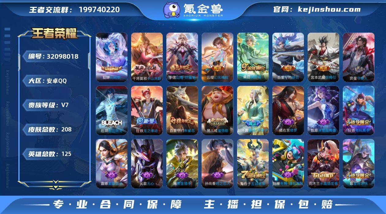 实名: 可修改 性别: 男号 贵族等级: V7 英雄数: 125 皮肤数: 208 荣耀水晶: 幻阙歌 传说皮: 碎云,山海·炽霜斩,惊梅引,幻光神枪,千山共赴 限定皮: 朱雀志,高山流水,猪悟能,匿光追影者,五谷丰年,降魔,鸣野蒿 亮点: 【优质装备】:幻阙歌(貂蝉典藏),碎云,山海·炽霜斩(李信年限),惊梅引,千山共赴