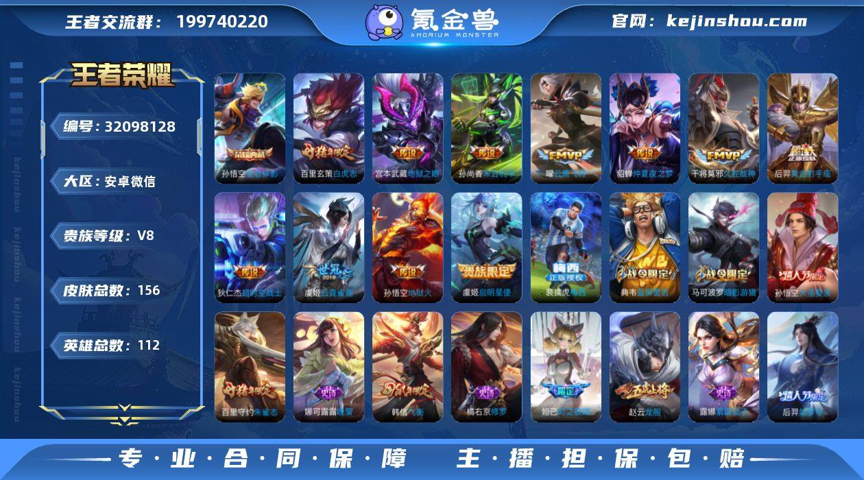 实名: 可修改 性别: 男号 贵族等级: V8 英雄数: 112 皮肤数: 156 荣耀水晶: 全息碎影 传说皮: 黄金射手座,云鹰飞将,久胜战神,云霓雀翎,末日机甲-孙尚香,地狱火,仲夏夜之梦,地狱之眼,超时空战士-狄仁杰 限定皮: 龙胆,幽恒,时之彼端,飞衡,白虎志,朱雀志,梅西,如梦令-后羿,大圣娶亲,五谷丰年 亮点: 【优质装备】:全息碎影(猴子典藏),黄金射手座,云鹰飞将(小将军),久胜战神,云霓雀翎,末日机甲-孙尚香(绿蚂蚱),地狱火,仲夏夜之梦(大飞蛾),地狱之眼,超时空战士-狄仁杰