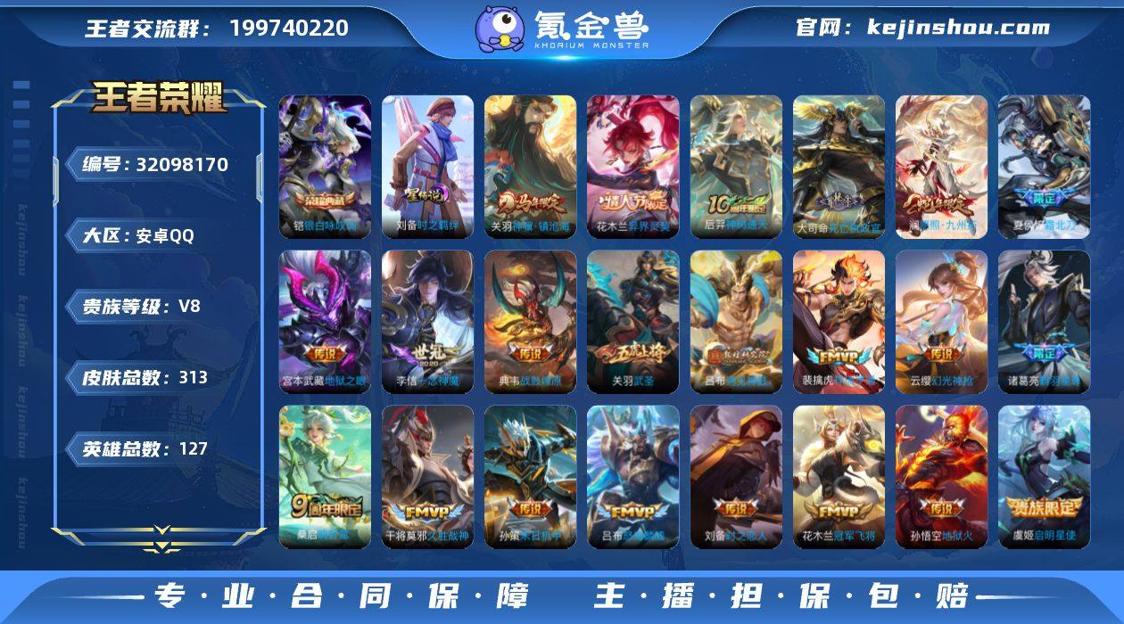 贵族等级:V8 典藏皮肤数:1 珍品无双皮肤数:0 无双皮肤数:0 珍品传说皮肤数:0 传说皮肤数:23 史诗皮肤数:95 皮肤数:313 英雄数:127 段位:至圣王者