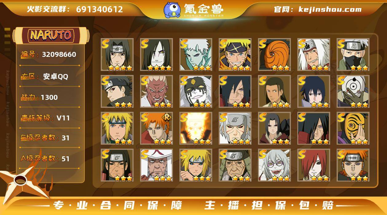 【性价比中配号 有超哥 活动价】y6951 战力1300w 31s 51a 熊猫 4个198a 1w8金币 30抽 25忍法帖已开41级 四星大蛇丸 须佐鼬 34片六尾鸣人 53片自来也 34片金水