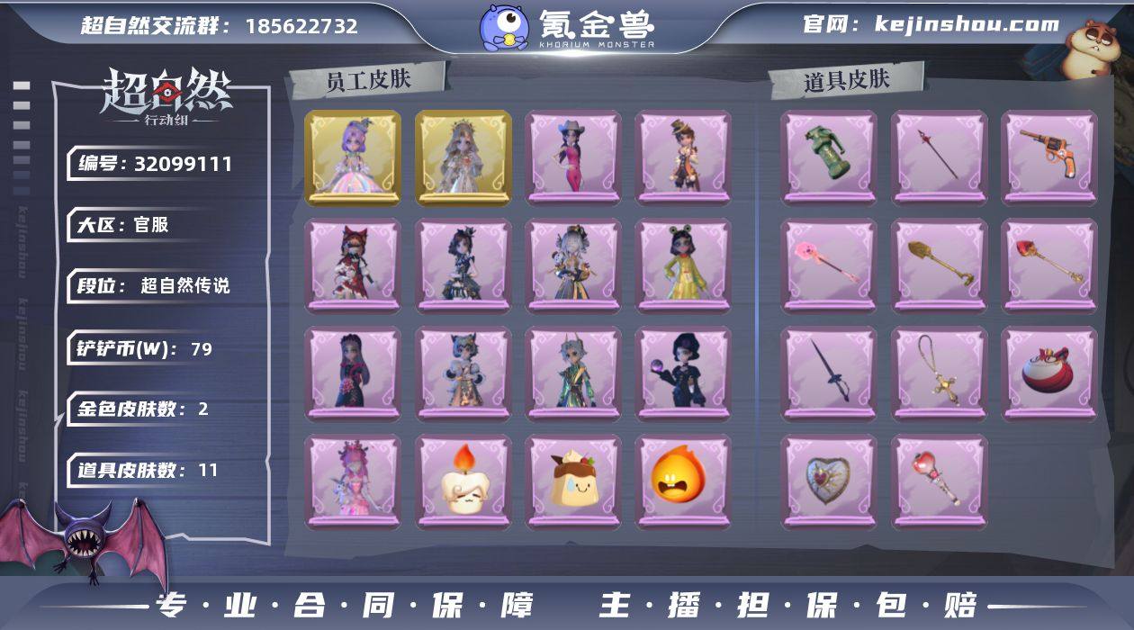 金色皮肤数量: 2 紫色皮肤数量: 11 道具皮肤数量: 11 段位: 超自然传说 外观: 遗失的童话,圣光之谕,丝缕哀歌,霓裳踏雪,泽引山海,黑月挽歌,情公主,嘻嘻头套,烈焰红唇头套,呆滞头套,炙热烧烤,卑微头套,哈士奇头套,滑稽头套,鳄霸天头套,鱼头怪头套,面具马头套,萨卡班甲鱼头套,驼半仙头套,天使的呼唤,天使消失的年代,小小玛丽,钗头凤,呱呱雨衣,小小冰公主,除妖小师妹,火爆了头套,异色序曲,莓果陷阱,樱桃奶油布丁,暗夜小恶魔,耀眼的你,庆宴绮愿,烛光纪念,牛啤背包