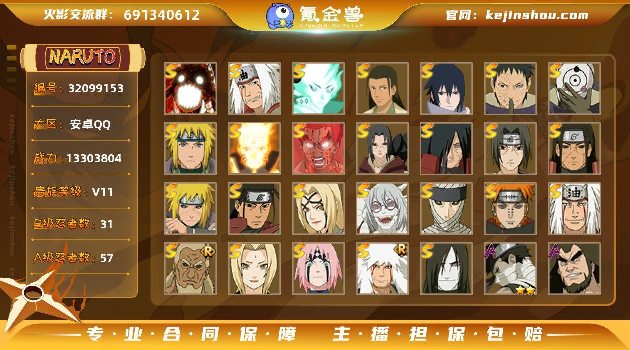 安卓QQ-可二次-v11-一千三百万战力号-5个直购a忍-飘带黑绝-入坑首选免氪号-S忍者数:31- A忍者数:57宇智波带土「漂泊浪客」(2星)宇智波佐助「侠隐江湖」(2星)旗木卡卡西「万花筒写轮眼」(2星)神秘面具男「忍者之路」(2星)黑绝(2星) 【S级忍者】宇智波带土「忍界大战」(3星),迈特凯「死门」(3星),自来也「传说中的三忍」(3星),大筒木舍人「最终章」(3星),漩涡鸣人「暴怒·第六尾」(3星),宇智波斑「秽土转生·解」(3星),宇智波佐助「永恒万花筒」(3星),春野樱「忍界大战」(3星),千手柱间「秽土转生」(3星),漩涡鸣人「九喇嘛连结」(3星),波风水门「九喇嘛连结」(3星),宇智波斑「白面具」(3星),药师兜「仙人模式」(3星),千手扉间「秽土转生」(3星),宇智波斑「秽土转生」(3星),波风水门「秽土转生」(3星),自来也「舞之豪杰」(3星),宇智波鼬「秽土转生」(3星),宇智波鼬「须佐能乎」(4星),漩涡鸣人·宇智波佐助(3星),佩恩「天道」(3星),千手柱间(3星),宇智波斑「五影会谈」(3星),波风水门(3星),纲手(3星),自来也(3星),大蛇丸(4星),猿飞日斩「秽土转生」(3星),无「二代目土影」(3星),纲手「百豪」(3星),艾「三代目雷影」(3星), 【A级忍者】宇智波佐助「须佐能乎」(2星),大蛇丸「晓」(2星),药师兜「半蛇斗篷」(2星),旗木卡卡西「幻之真容」(2星),漩涡鸣人「仙人模式」(2星),漩涡鸣人「九尾查克拉」(2星),桃地再不斩「漂泊武士」(2星),迪达拉「秽土转生」(2星),猿飞木叶丸(3星),黑土「四代目土影」(2星),宇智波带土「漂泊浪客」(2星),千代「近松十人卫」(2星),黑绝(2星),我爱罗「忍界大战」(2星),蝎「绯流琥」(2星),秋道丁次「忍界大战」(2星),宇智波泉奈(2星),神农「羁绊」(2星),春野樱「百豪」(2星),勘九郎「忍界大战」(2星),照美冥「五代目水影」(2星),志村团藏(2星),...