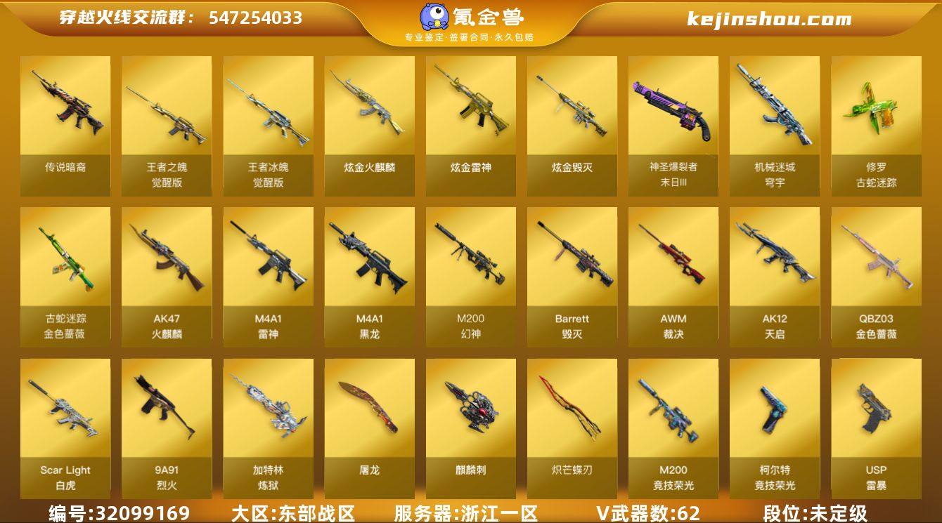 【自带包赔 最高三倍】:东部战区:浙江一区-LV100-元首-枪王3-62V-3王者武器数-3炫金武器数 【传说武器】:传说暗裔 【热门武器】:传说暗裔,QBZ03-金色蔷薇,Scar Light-白虎,M200-幻神,金色蔷薇-古蛇迷踪,修罗-古蛇迷踪,M200-竞技荣光,金色小号,牛牛-AK47,M4A1-黑骑士*2,加特林-炼狱,羊驼玩偶,裁决-雪莉杨,USP-雷暴,炽芒蝶刃,COP 357-极地霜雄*2 【王者炫金武器】:炫金火麒麟,炫金雷神,炫金毁灭 【音效卡】:M4A1-雷神音效卡,M4A1-黑骑士音效卡,Scar Light-白虎音效卡*2,绝迹语音包 【皮肤】:Scar Light-白虎-暗星,白虎-量子聚变 皮肤,裁决-星际旅行 皮肤,雷神-暗月,雷神-荣耀之魄,雷神-星空,雷神-机甲刑天皮肤,雷神-宇航兔皮肤,雷神-源计划2.0专属 皮肤,火麒麟-平天大圣,火麒麟-百城,毁灭-BEAN-2020MVP,M4A1-千变-孔明皮肤,黑骑士-地狱火,黑骑士-战神马超,黑骑士-伏羲,AK47-B-常胜将军-孙权,修罗-能量核心,屠龙-春桃 皮肤,麒麟刺-量子聚变 皮肤 【角色】:电竞教官-云悠悠(四防),鹰,王者葵-惊若翩鸿(四防),狐影,蛇隐宗,乔伊教练,初恋灵狐,芳心审判者,风暴女,娟娟,麻雀,潘多拉-甜心教官,蛇姬,蜀雪,兔囡囡,樱-战斗天使,职业选手 【人偶武器】:裁决-雪莉杨,火麒麟-灵狐,牛牛-AK47,迷你裂空之翼*4,迷你波特博士*4,夺魂,深渊终结者手雷,迷你艾比,迷你超能女侍 【挑战大师】:冰龙粉碎者-白马银枪*2,激光毁灭者III-白马银枪*2,机甲撕裂者III,试炼破坏者III,神圣爆裂者-末日III,阐释者III 【英雄级武器】:AK47-火麒麟,M4A1-黑龙,M4A1-雷神,M4A1-黑骑士*2,AK47-无影*2,AK12-天启,Scar Light-白虎,金色蔷薇-古蛇迷踪,QBZ03-金色蔷薇,9A91-烈火,王者之魄-觉醒版,王者冰魄-觉醒版,机械迷城-穹宇,Barrett-毁灭,AWM-裁...