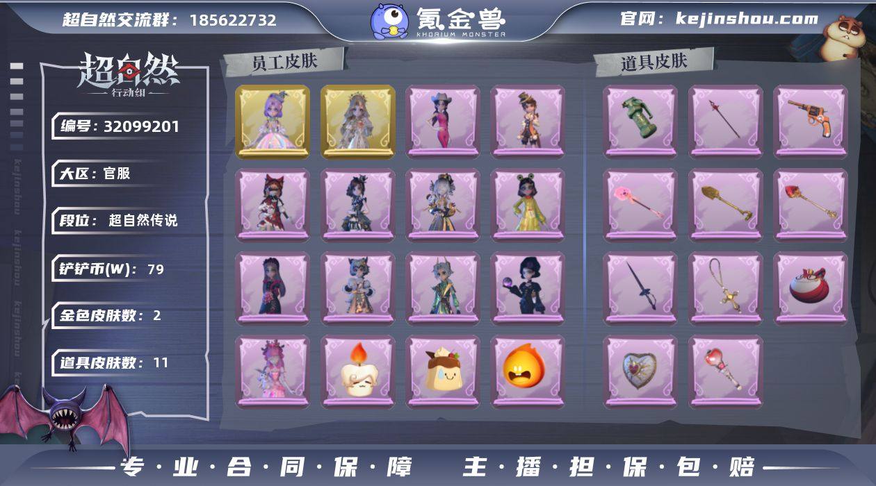 2金皮 11紫皮 金戈玄铜,宝剑八,绯红柴郡猫,祝祷词,永眠曲,圣心之泪,龙鳞,罪棘,赞萌波板糖,新星时代,桃心道具 山楂树之舞,带你逃跑吧,要糖,举牌,舞台中心,心跳摇,小雨摇,抬手动作 5级梦居 超自然传说 【服装】暗夜小恶魔,庆宴绮愿,耀眼的你,烛光纪念,樱桃奶油布丁,莓果陷阱,异色序曲,牛啤背包,鳄霸天头套,滑稽头套,哈士奇头套,卑微头套,炙热烧烤,呆滞头套,烈焰红唇头套,嘻嘻头套,情公主,黑月挽歌,面具马头套,泽引山海,霓裳踏雪,丝缕哀歌,圣光之谕,遗失的童话,鱼头怪头套,萨卡班甲鱼头套,火爆了头套,钗头凤,除妖小师妹,小小冰公主,呱呱雨衣,小小玛丽,驼半仙头套,天使消失的年代,天使的呼唤 【道具】金戈玄铜,宝剑八,绯红柴郡猫,祝祷词,永眠曲,圣心之泪,龙鳞,罪棘,赞萌波板糖,新星时代,桃心 【动作】山楂树之舞,带你逃跑吧,要糖,举牌,舞台中心,心跳摇,小雨摇,抬手