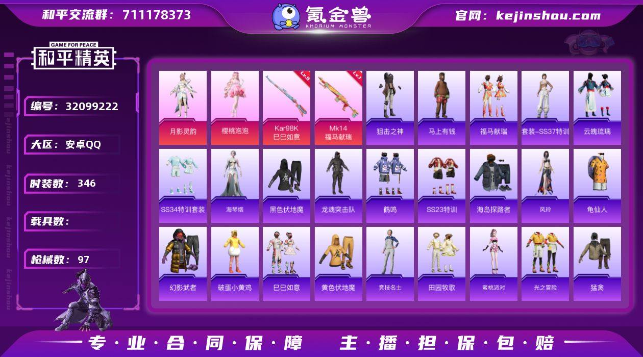 实名:可二次实名 是否支持人脸包赔:支持 粉装数量:2 特效枪数量:2 时装数:346 枪械数:97 樱桃泡泡,月影灵韵 五级Kar98K-巳巳如意,一级MK14-福马献瑞 狙击之神,马上有钱,福马献瑞,SS37特训,云魄琉璃,SS34特训套装,缤纷果语,白兰地假日,白糯汤圆,白啸长虹,长空猛禽,顶瓜瓜,蝶变,大橘大利,都市魅力,电音精灵,风玲,疯狂小兔子,粉恋花,飞行日记,龟仙人,光之冒险,海岛探路者,鹤鸣,湖畔霞光,海琴烟,黑色伏地魔,黄色伏地魔,黄色名流,幻世战舞者,幻影武者,酒红色名流,竞技达人朋克,竞技名士,吉莉礼服,街头潮人,空岛之星,蓝冰羽,蓝彩潮人,龙的传人,灵公主,龙魂突击队,龙腾端午,莱茵河畔,恋语绒绒,冷焰舞者,猛禽,萌黄之夏,魅力单车,蜜桃派对,霓虹街区,破蛋小黄鸡,破晓战魂,轻风白浪,青涩时光,骑行爱好者,人气偶像,深蓝色名流,SS14特训,SS20特训,SS21特训,SS22特训,SS23特训,SS26特训,SS27特训,SS28特训,SS29特训,SS30特训套装,SS31特训套装,SS32特训套装,SS33特训套装,巳巳如意,特训学院,田园牧歌,香桃花海,星途旅人,星影赞美诗,耀粉歌者,玉兔迎春,鱼渊荷华,燕燕于飞,智谋强哥,众神之王,紫幽梦,灼焰舞者 祥瑞锦鲤飞行器,未来领航者降落伞,旋转彩虹降落伞,樱桃泡泡降落伞