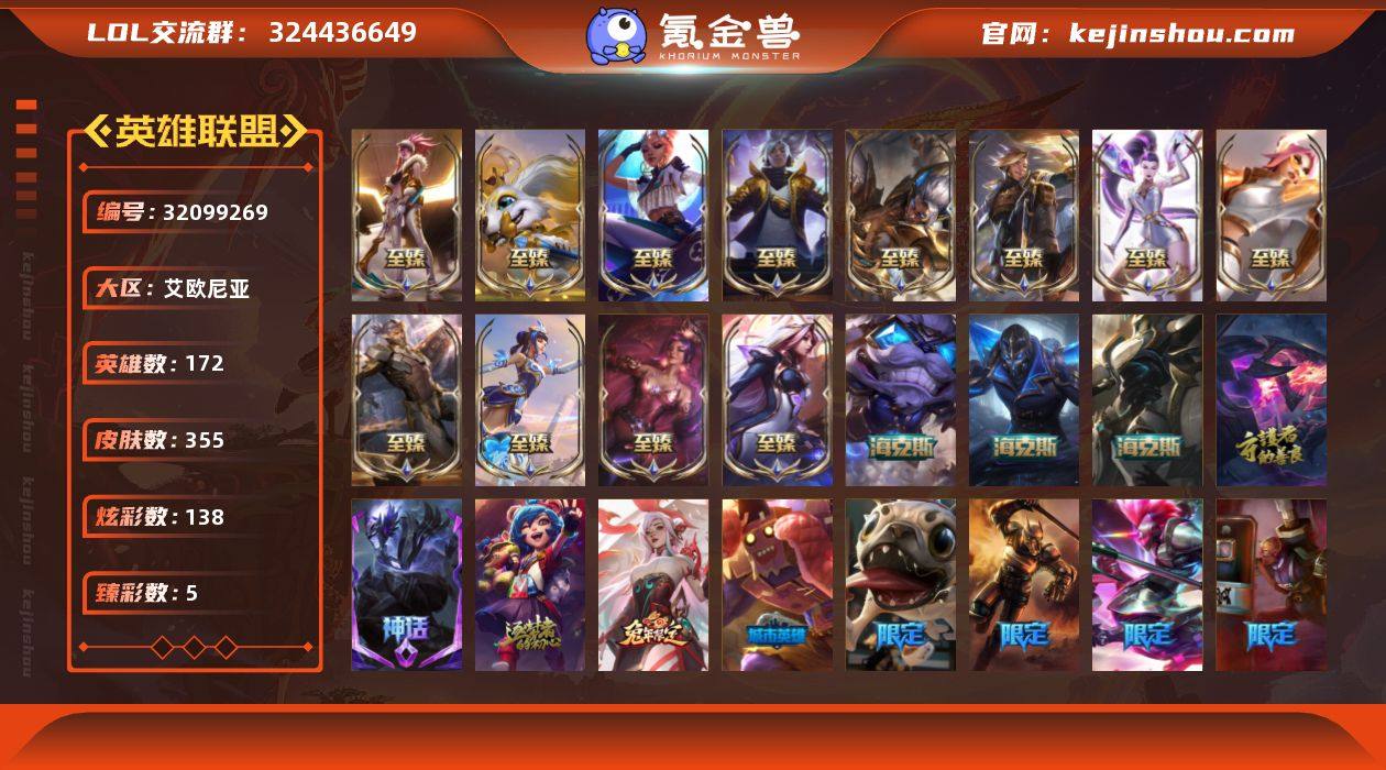 【LOLX1477】172英雄/355皮肤/19神话/41限定/5臻彩/138炫彩/35传说/93史诗/未定级/10周年 安妮/暗星 科加斯/10周年庆典 凤凰/灰烬杀手 塞拉斯/海克斯 吉格斯/海克斯 卡萨丁/海克斯 人马/至臻 真实伤害 奇亚娜/至臻 真实伤害 亚索/至臻 福牛守护者 菲奥娜/至臻 剪纸仙灵 希维尔/至臻 绝息圣堂 厄运小姐/至臻 K/DA 阿卡丽/至臻 K/DA ALL OUT卡莎/至臻 灵能特工 伊泽瑞尔/至臻 青花瓷 拉克丝/至臻 绒毛菲兹/至臻 神龙尊者 炎龙瑟提/至臻 源计划:逆流 塞拉斯/无畏骑士 瑟庄妮 赤子初心/冠军之隐 劫 凯旋圣装/星之守护者 娑娜 未来之光/源计划: 火 菲奥娜 惩戒/剪纸仙灵 艾瑞莉娅/穿心之剑 菲奥娜/持胡萝卜的雪人 易/圣诞开心鬼 提莫/“主人不要我了” 阿木木/平安夜女神 娑娜/英勇玩具兵船长/邪恶圣诞老人 维迦/冰雪节 茂凯/冬季仙境 发条/圣诞玩偶 波比/魄罗骑士 瑟庄妮/冰雪节 炼金/冠军典狱长 锤石/冠军之隐 劫/S2 暗杀星 慎/S4 SSW 图奇/S6 SKT T1 艾克/S6 SKT T1 奥拉夫/S6 SKT T1 扎克/S8 IG 乐芙兰/S12 DRX 亚托克斯/胜利枪神 格雷福斯/胜利女神 奥莉安娜/胜利之剑 亚托克斯/胜利枪神 卢锡安/胜利机器人 布里茨/胜利女神 瑟庄妮/胜利凤凰 艾尼维亚/胜利之王 泰达米尔/胜利剑圣 易/海贼 瑞兹/无头骑士 赫卡里姆/泳池派对 李青/泳池派对 塔里克/蒙多蒙多/电玩战魂 赫卡里姆/防暴士兵 辛吉德/防暴天使 凯尔/警用试作体K-9 内瑟斯/克格汪/铁哥们儿 奥拉夫/魔幻卡牌 崔斯特/战场女武神 凯尔/源计划:林 易/墨之影武者 易/霸天零式 赛恩/日蚀骑士 希维尔/提莫:"约德尔人的一大步"/烈焰雄心 崔丝塔娜/驯龙炮手 崔丝塔娜/合金巨兽 努努和威朗普/女皇 艾希/绅士 科加斯/双重冰晶 艾尼维亚/黯晶凤凰 艾尼维亚/电玩女神 娑娜/女警狙击 凯特琳/地狱行者 孙悟空/第三类接触 黑默丁格/驯龙学者 黑默丁格/屠龙勇士 潘森/腥红之...