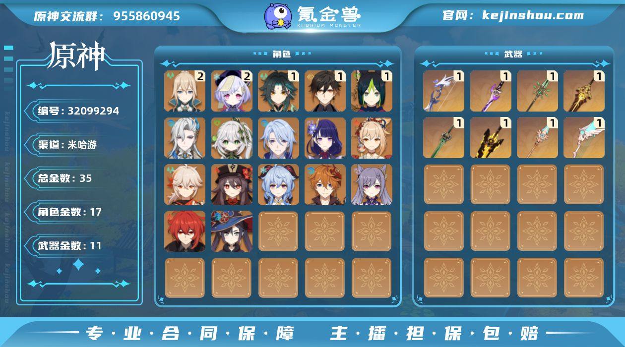 58级/35黄/男主/17个五星角色/11个五星武器 0命那维莱特,0命纳西妲,1命提纳里,0命神里绫人,0命雷电将军,0命枫原万叶,1命钟离,0命胡桃,0命甘雨,1命魈,0命宵宫,0命达达利亚,0命刻晴,2命七七,2命琴,0命莫娜,0命迪卢克,精1苇海信标,精1若水,精1雾切之回光,精1无工之剑,精1磐岩结绿,精1和璞鸢,精1天空之脊,精1天空之翼