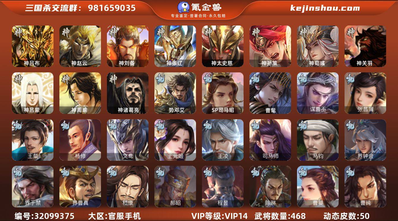 【14789395】官阶:大将军;VIP等级:VIP14;史诗武将数量:79;动态皮肤数量:50;武将总数:468;史诗宝珠数量:1;将魂数量:1189;神将:8;魏国史诗武将:34;蜀国史诗武将:16;吴国史诗武将:12;群史诗武将:22 神吕布,神赵云,神刘备,神张辽,神太史慈,神孙策,神荀彧,神诸葛亮,SP司马昭,曹髦,张昌蒲,王粲,杨修,王元姬,王凌,司马师,马钧,界钟会,界于禁,界曹真,嵇康,郝昭,陈琳,曹婴,曹纯,戏志才,刘晔,谋曹丕,程昱,势邓艾,势钟会,关索,谋诸葛亮,马云騄,谋赵云,谋马超,诸葛瞻,赵襄,张星彩,王平,沙摩柯,谯周,界黄忠,花鬘,董允,谋关羽,势魏延,谋黄盖,吴景,孙皓,骆统,留赞,界朱然,界徐盛,界步练师,贺齐,势太史慈,文鸯,裴秀,左慈,张让,星黄忠,星甘宁,王允,苏飞,司马徽,审配,麹义,南华老仙,祢衡,刘焉,沮授,界左慈,界李儒,公孙康,卑弥呼,许攸,星董卓,兀突骨,士燮,神吕蒙,神周瑜,神关羽,SP关羽,SP曹仁,SP蔡文姬,乐进,曹昂,诸葛诞,朱灵,文聘,SP姜维,张春华,钟会,曹冲,郭淮,满宠,界王异,界曹操,界司马懿,界夏侯惇,界张辽,界许褚,界郭嘉,李典,曹真,韩浩史涣,陈群,曹叡,曹休,钟繇,司马朗,王基,李通,郭皇后,孙资刘放,辛宪英,界甄姬,吕虔,鲁芝,蒯越蒯良,界典韦,界荀彧,界徐晃,杜畿,界曹丕,毌丘俭,界邓艾,张恭,贾逵,界曹植,界满宠,界郭淮,卞夫人,华歆,蔡贞姬,袁涣,王双,崔琰,杨阜,曹嵩,谋于禁,谋甄姬,谋荀彧,界曹休,牵招,胡班,成济,玄毌丘俭,司马孚,牛金,界夏侯渊,界曹仁,臧霸,唐咨,董昭,SP孙尚香,关银屏,夏侯霸,马良,关兴张苞,廖化,界马岱,关平,简雍,刘封,界法正,界关兴张苞,界刘备,界关羽,界张飞,界赵云,界马超,SP徐庶,吴懿,周仓,张松,刘谌,夏侯氏,糜竺,马忠,孙乾,李严,黄皓,吴苋,秦宓,界黄月英,界诸葛亮,赵统赵广,严颜,界伊籍,界卧龙诸葛,界庞统,界孟获,界祝融,陈到,界姜维,界刘禅,胡金定,吕凯,张翼,杨仪,界廖化,邓芝,傅肜,界简雍,费祎...