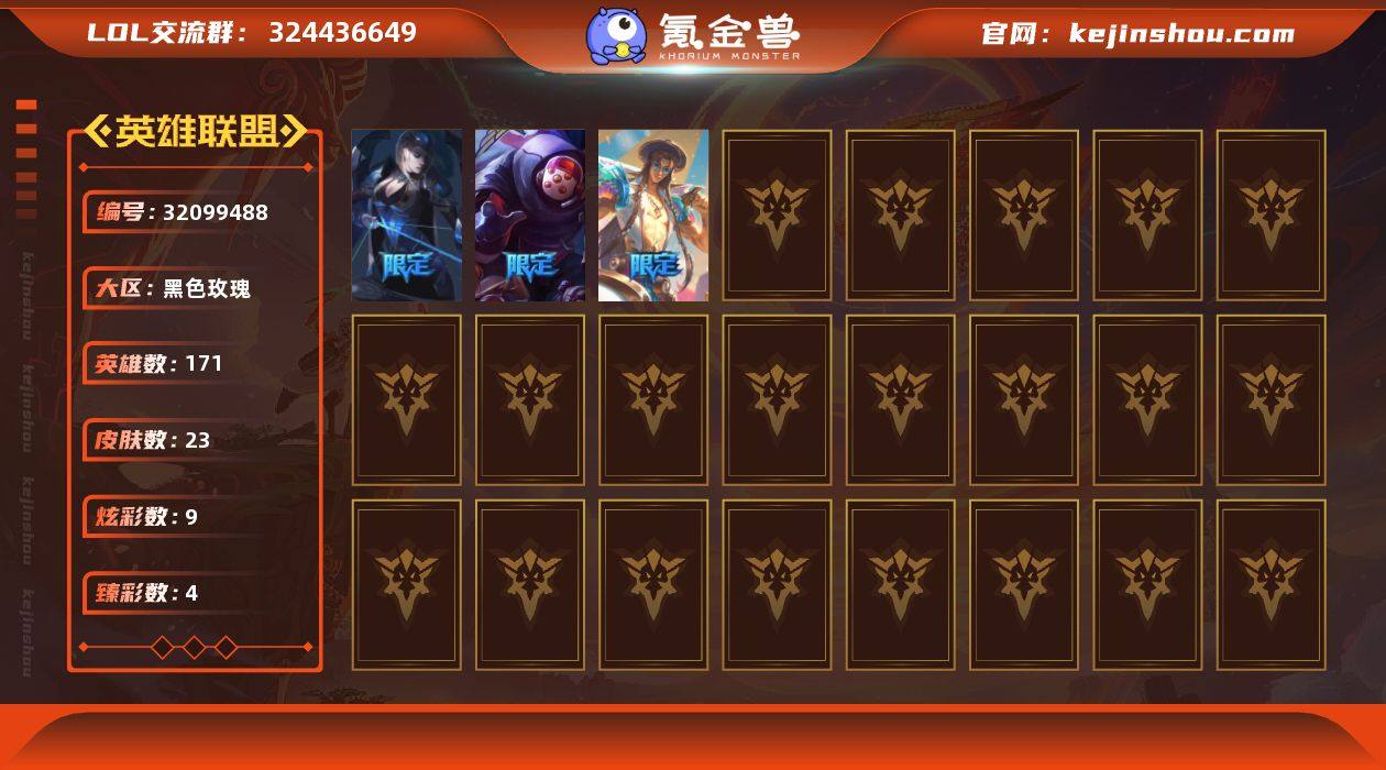 【LD5176】171英雄/23皮肤/6限定/4臻彩/9炫彩/7史诗/青铜/冠军之刃 锐雯 2016 凯旋圣装/闭月之颜 貂蝉 炫金莲华/西部魔影 卢锡安 贝利尔之怠/幽梦玫瑰 泰隆 浪漫花蕾/冠军之箭 艾希/S3 SKT T1 贾克斯/暗裔英雄 盖伦/胜利女神-菲奥娜/海之歌 永恩/法国皇室 厄运小姐/侏罗纪化石 科加斯/飞越疯人院 萨科/夜行义贼 艾瑞莉娅/冰川勇者 伊泽瑞尔/天启骑士 杰斯/腥红之月 锤石/赵云子龙/魔女乐芙兰/五杀摇滚女声主唱凯尔/伏虎之力锐雯/坚韧不屈沃利贝尔/猎户星神韦鲁斯/创世之神赫卡里姆/KDAALLOUT卡莎/灵魂莲华莉莉娅/黑夜使者莉莉娅