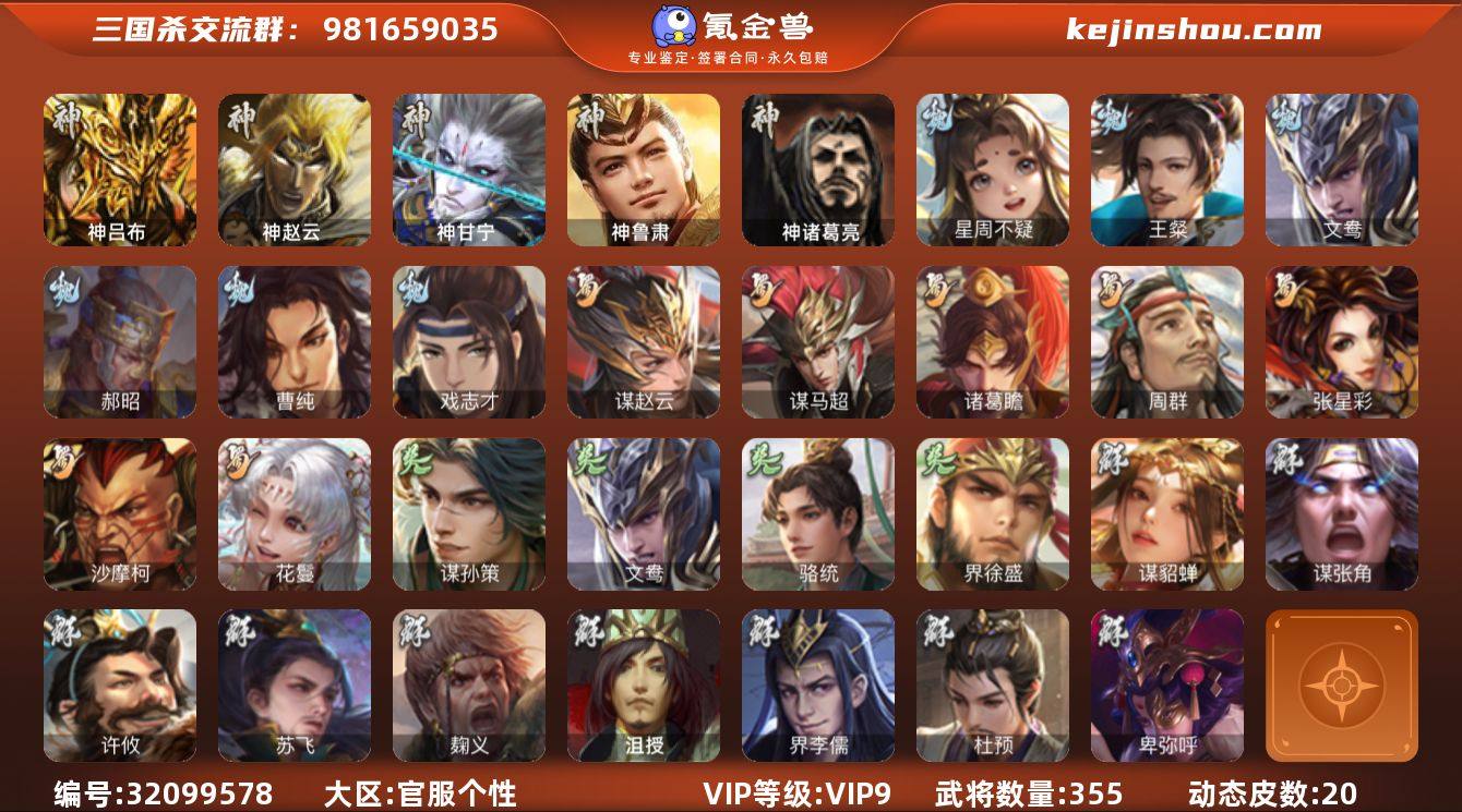 【666】官阶:骠骑将军;VIP等级:VIP9;史诗武将数量:31;动态皮肤数量:20;武将总数:355;史诗宝珠数量:17;将魂数量:1590;神将:7;魏国史诗武将:12;蜀国史诗武将:7;吴国史诗武将:3;群史诗武将:11 神吕布,神赵云,神甘宁,神吕蒙,神周瑜,神诸葛亮,神鲁肃,星周不疑,王粲,文鸯,郝昭,曹纯,戏志才,谋赵云,谋马超,诸葛瞻,周群,张星彩,沙摩柯,花鬘,谋孙策,骆统,界徐盛,谋貂蝉,苏飞,麹义,沮授,界李儒,杜预,卑弥呼,谋张角,张绣,李傕,许攸,神郭嘉-虎年清明(动态),神诸葛亮-观星唤雨,神曹操-天下归心,星周不疑-才广志宏(动态),SP蔡文姬-兔年冬日(动态),邓艾-神兵天降(动态),界邓艾-神兵天降(动态),戏志才-举棋若定(动态),曹纯-虎年春节(动态),司马昭-昭威淮南(动态),费祎-安民护祚(动态),马超-牛年春节(动态),界马超-牛年春节(动态),关银屏-兔年春节(动态),胡金定-明良千古(动态),周处-义除三害(动态),孙权-牛年七夕(动态),孙策-猪年七夕(动态),界孙权-牛年七夕(动态),孙鲁育-牛年端午(动态),袁绍-声震寰宇(动态),SP赵云-单骑救主(动态)