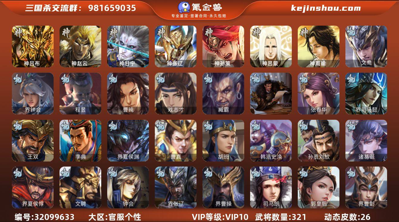 【14789402】官阶:骠骑将军;VIP等级:VIP10;史诗武将数量:32;动态皮肤数量:26;武将总数:321;史诗宝珠数量:21;将魂数量:4908;神将:5;魏国史诗武将:10;蜀国史诗武将:4;吴国史诗武将:7;群史诗武将:13 神吕布,神赵云,神甘宁,神张辽,神孙策,界钟会,曹纯,戏志才,程昱,关索,谋马超,沙摩柯,花鬘,骆统,留赞,界朱然,界徐盛,势太史慈,文鸯,谋貂蝉,界沮授,左慈,杨彪,苏飞,司马徽,审配,沮授,界李儒,公孙康,杜预,许攸,兀突骨,神吕蒙,神周瑜,SP关羽,SP曹仁,SP蔡文姬,乐进,曹昂,诸葛诞,朱灵,文聘,SP姜维,张春华,钟会,曹冲,郭淮,满宠,界王异,界曹操,界司马懿,界夏侯惇,界张辽,界许褚,界郭嘉,李典,曹真,韩浩史涣,陈群,曹叡,钟繇,司马朗,王基,李通,郭皇后,孙资刘放,辛宪英,界甄姬,吕虔,鲁芝,界荀彧,杜畿,界曹丕,张恭,界曹植,界曹彰,界满宠,卞夫人,辛毗,华歆,蔡贞姬,王双,崔琰,谋徐晃,谋于禁,界曹休,牵招,胡班,界夏侯渊,臧霸,唐咨,SP孙尚香,关银屏,夏侯霸,马良,关兴张苞,廖化,界马岱,关平,简雍,刘封,界法正,界关兴张苞,界刘备,界关羽,界张飞,界赵云,界马超,SP徐庶,吴懿,周仓,张松,刘谌,夏侯氏,糜竺,黄皓,界黄月英,赵统赵广,严颜,界伊籍,界庞统,界祝融,吕凯,界廖化,邓芝,陈震,王甫赵累,界周仓,刘巴,彭羕,谋庞统,界张嶷,谋张飞,诸葛果,界魏延,糜芳傅士仁,甘夫人,鲁肃,孙茹,凌操,大乔小乔,诸葛恪,诸葛瑾,孙鲁育,程普,韩当,潘璋马忠,虞翻,朱然,界甘宁,界吕蒙,界黄盖,界周瑜,界大乔,界陆逊,孙鲁班,朱桓,顾雍,孙休,全琮,阚泽,孙登,界孙权,界孙尚香,孙亮,严畯,界孙坚,吕岱,界孙策,界张昭张纮,卫温诸葛直,界凌统,桥公,孙翊,蒋钦,吕范,谋吕蒙,界孙休,界朱治,孟达,蔡文姬,伏完,刘协,界袁术,SP赵云,SP貂蝉,张宝,伏皇后,李儒,界于吉,华雄,袁术,界华佗,界吕布,公孙瓒,蔡夫人,公孙渊,郭图逢纪,蹋顿,严白虎,SP黄月英,曹节,蔡邕,界貂蝉,SP太...