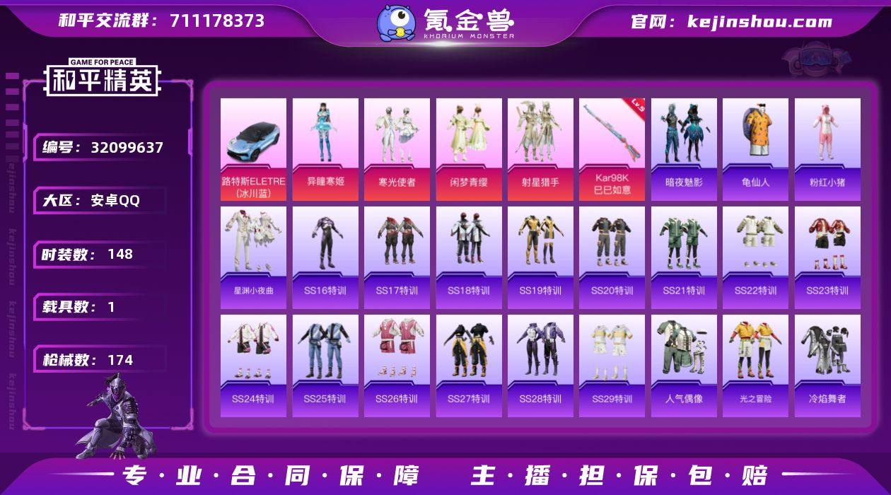 J2484 【性价比小号】4粉 2特 1载 异瞳寒姬 闲梦青樱 寒光使者 蛇星猎手 满级巳巳如意 安卓 手Q-4粉装-2特效枪-1载具-0粉色飞行器-54505热力值-17王牌印记-148套装-174枪皮 【热门品类】:套装-龟仙人,套装-粉红小猪 【粉色套装】:粉装-寒光使者,粉装-闲梦青缨,粉装-射星猎手,角色-异瞳寒姬 【粉色枪皮等级】:Kar98K-巳巳如意(五级),Mk14-福马献瑞(二级) 【粉色载具】:路特斯ELETRE(冰川蓝) 【粉色枪皮】:Kar98K-巳巳如意,Mk14-福马献瑞 【粉色降落伞】:暗夜玫瑰降落伞,洛神天依降落伞,暗星紫秘降落伞,冷魅冰骑降落伞,飒粉甜心降落伞,闲梦青缨降落伞,圣堂之誓降落伞,精灵梦叶罗丽降落伞 【稀有套装】:套装-龟仙人,套装-马上有钱,套装-星渊小夜曲 【稀有枪皮】:AKM-彩虹符号,AKM-破晓战魂,AKM-萌趣颜团子,AKM-虎虎生威,AKM-霓虹街区,AKM-龙的传人,M16A4-幻世战舞者,M16A4-甜心亚梦,M16A4-红色方程式,SCAR-L-炫彩节奏,SCAR-L-玉兔迎春,SCAR-L-红色方程式,M416-夜灯,M416-糯团青竹,M416-红色方程式,M416-蓝色火焰,GROZA-异彩先驱,GROZA-彩虹符号,GROZA-恐龙拽拽,GROZA-林间仙鹿,GROZA-田园牧歌,AUG-天降萌叽,AUG-耀粉歌者,QBZ-绚金瑰梦,QBZ-飞驰魅影,M762-天降萌叽,M762-暗夜鎏金,M762-瑞龙福将,M762-第五大道,Mk47-妙红点点,Mk47-洛神天依,G36C-炙焰牛王,G36C-星穹咏叹调,AC-VAL-天降萌叽,AC-VAL-快闪甜心,AC-VAL-甜心亚梦,蜜獾-千面幻镜,蜜獾-垂柳戏鸭,蜜獾-天降萌叽,蜜獾-娇憨猪猪,UZI-啾咪啾咪,UZI-天降萌叽,UZI-娇憨猪猪,UZI-炫彩节奏,UZI-红色方程式,UMP45-仲夏莫吉托,UMP45-海渊国主,UMP45-涂山之恋,UMP45-生命誓言,Vector-生命誓言,Vector-田园牧歌,汤姆逊-奇异狩猎者,汤姆逊-庄周梦蝶,汤姆逊-异彩先驱,汤姆逊-炫彩节奏,汤...