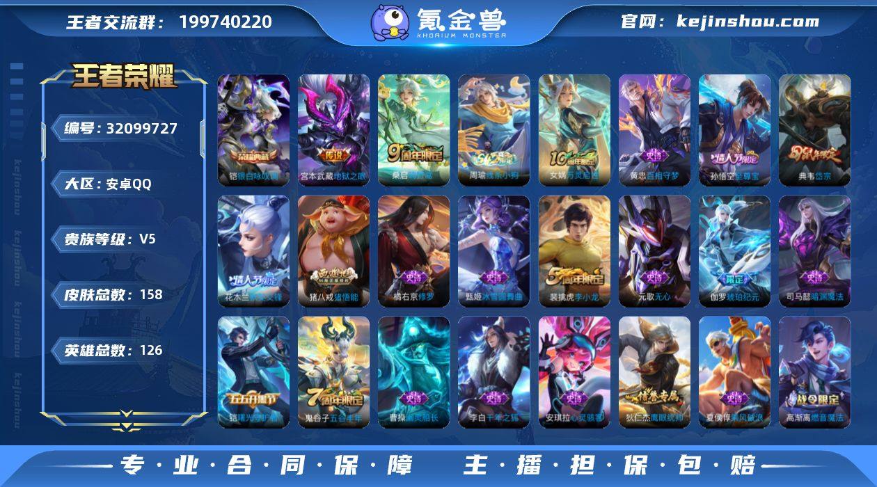 2447708 王者荣耀账号 安卓Q-V5-永恒钻石III段位-126英雄-158皮肤-1典藏皮肤-2传说-40史诗 【英雄全皮】:孙权全皮 【荣耀典藏】:铠银白咏叹调 【传说皮肤】:桑启鸣野蒿,宫本武藏地狱之眼 【限定皮肤】:姜子牙天穹之誓,狄仁杰阴阳师,赵云皇家上将,庄周高山流水,高渐离玩趣恶龙,扁鹊奇幻香踪,芈月幻夜卜梦,元歌无心,典韦岱宗,达摩沙漠行僧,项羽海滩派对,兰陵王金庭之子,花木兰默契交锋,孙悟空至尊宝,李元芳云中旅人,杨戬潮玩骑兵,干将莫邪胡桃夹子,鬼谷子五谷丰年,黄忠火炮绅士,苏烈千军破阵,沈梦溪大漠名商,沈梦溪匿光破解者,裴擒虎李小龙,裴擒虎擒涛扼浪,猪八戒猪悟能,鲁班大师探海日志,桑启海盐诗旅,艾琳女武神,阿古朵江河有灵,张良古海寻踪,蒙犽百解令,高渐离燃音魔法,妲己灵卜魔法,鬼谷子天穹祈灯,伽罗琥珀纪元,沈梦溪龙舞盛年,刘邦剑破天穹,程咬金群星魔术团,周瑜熔金海岸 【年限皮肤】:典韦岱宗 【赛季限定】:苏烈千军破阵,达摩沙漠行僧,兰陵王金庭之子,沈梦溪大漠名商,李元芳云中旅人,桑启海盐诗旅,裴擒虎擒涛扼浪,鲁班大师探海日志,张良古海寻踪,鬼谷子天穹祈灯,刘邦剑破天穹,姜子牙天穹之誓,东皇太一噬灭天穹,甄姬逆浪荇歌 【战令限定】:黄忠火炮绅士,芈月幻夜卜梦,扁鹊奇幻香踪,杨戬潮玩骑兵,高渐离燃音魔法,妲己灵卜魔法,周瑜线条小狗 【史诗皮肤】:周瑜线条小狗,女娲万灵启世,黄忠百相守梦,伽罗琥珀纪元,高渐离燃音魔法,妲己灵卜魔法,蒙犽百解令,阿古朵江河有灵,沈梦溪匿光破解者,扁鹊奇幻香踪,元歌无心,鬼谷子五谷丰年,黄忠火炮绅士,司马懿暗渊魔法,庄周高山流水,猪八戒猪悟能,花木兰默契交锋,裴擒虎李小龙,橘右京修罗,典韦岱宗,狄仁杰鹰眼统帅,孙策猫狗日记,李元芳逐浪之夏,刘禅天才门将,铠曙光守护者...