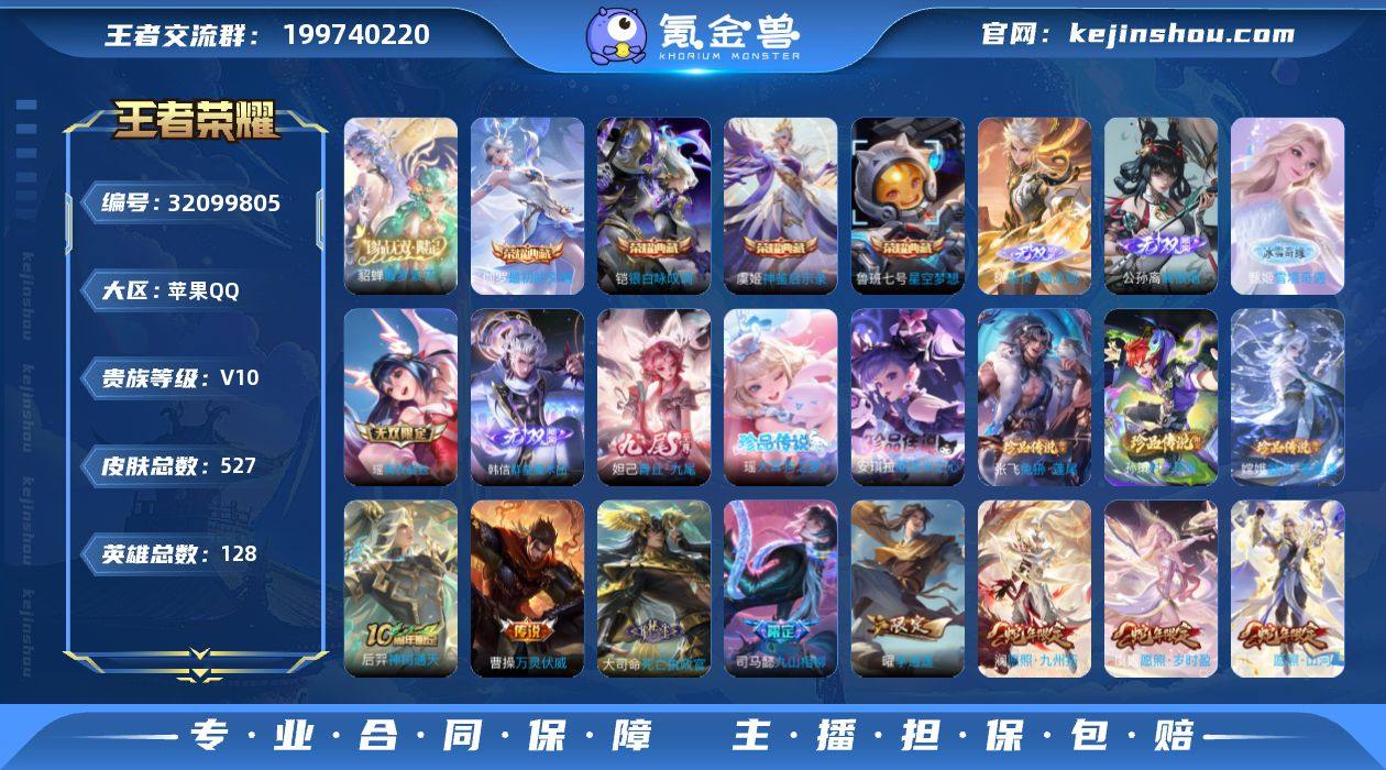 实名: 可修改 贵族等级: V10 英雄数: 128 皮肤数: 527 荣耀水晶: 星空梦想,银白咏叹调,神鉴启示录,最初的交响 无双皮: 真我赫兹(瑶),青丘·九尾,韩信群星魔术团,离恨烟,雪境奇遇-甄姬,器灵·螭龙剑 珍品传说: 时之奇旅-孙策,器灵·落星盏,兔狲·蓬尾,酷洛米之心,大耳狗之梦 传说皮: 黄金狮子座,黄金射手座,云鹰飞将,绛天战甲,黄金白羊座,久胜战神,炽阳神光,一念神魔,云霓雀翎,末日机甲-孙尚香,地狱火,仲夏夜之梦,音你心动-小乔,零号·赤焰,地狱之眼,飞鸢探春,音你心动-周瑜,胖达荣荣,李逍遥,乞巧织情,时之恋人-刘备,淬星耀世,超时空战士-狄仁杰,末日机甲-孙策,无双飞将,音你闪耀,碎云,山海·琳琅生,燃星之曲,画中仙,浮生妄,记忆之芯,百相守梦(张飞),追逃游戏(亚瑟),鹤羽星尊,灼幽烈阳,妄想实况,妄想奇谈,鹤归松栖(云缨),惊梅引,鲁班七号-时之奇旅,霜月吟,澜逐花归海,艾琳觅芳踪,琥珀纪元铠,乘龙·问璇玑,乘龙·铭钟鼎,乘龙·淬吴钩,吕布曦玄引,典韦战鼓燎原,黄金天蝎座,铠冥王哈迪斯,牧神诗旅,启明星使,玄雷天君,幻光神枪,祥瑞亨通,星之鸣奏,续相思,九山相柳,死亡执政官,万灵伏威,神树通天 限定皮: 李小龙,梁祝,御风骁将,引擎之心,龙胆,武圣,烈魂,辉光之辰,白晶晶,天狼溯光者,神威,永曜之星,奇迹圣诞,太华,逐梦之翼,冰霜恋舞曲,凤求凰,青龙志,玄武志,至尊宝,默契交锋-兰陵王,大圣娶亲,霸王别姬-项羽,霸王别姬-虞姬,高山流水,孙行者,猪悟能,女儿国国王,傲雪梅枪,百木心枪,匿光决锋者,唐三藏,五谷丰年,绯月行,诗剑行,降魔,怒海麟威,山海·玄木吟,影龙天霄,夏侯惇霜北刀,陌上桑,愿照·千秋盛,愿照·众生和,愿照·山河定,愿照·岁时盈,愿照·福禄聚,愿照·九州拓