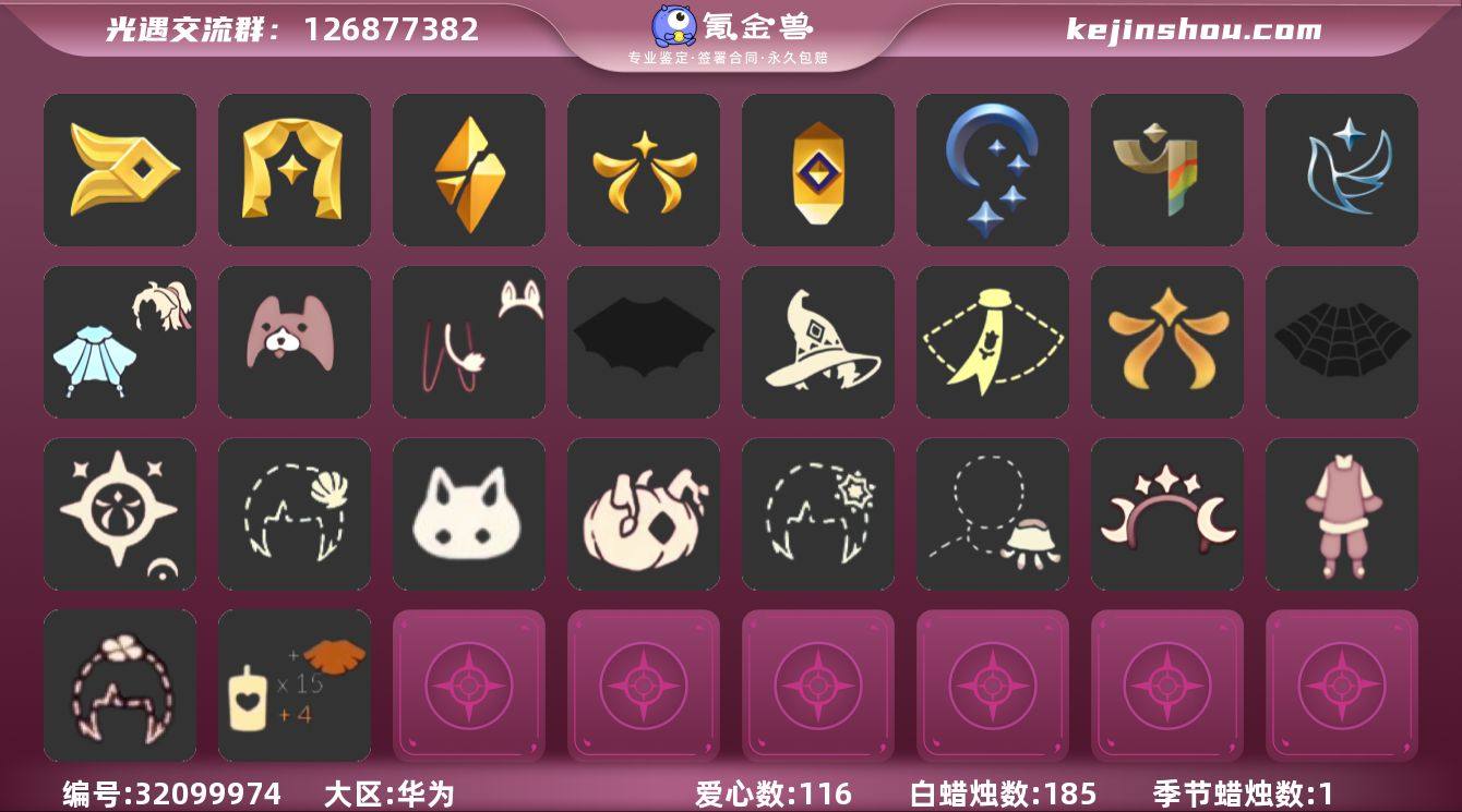 【A1022】区服:华为服,登入方式:手机【8季卡】白枭新年裤巫师帽鹿角蝙蝠斗王子围巾福娃红伞正太头虚荣发型,蜡烛数量:185,爱心:116,当前身高12.092,最高身高1.462,最矮身高13.462,已经毕业地图:雨林,霞谷,暮土,已经毕业季节:青鸟季,彩染季,夜行季,追忆季,欧若拉季,破晓季,表演季,风行季,稀有礼包:祥云瑞气服饰,水母肩饰,姆明饰品套装,星月头冠,彩虹耳机,彩虹耳饰,圣诞鹿角,多彩绒绒帽,巫师帽,南瓜头,贝壳,雪花发卡,玉兔,大桔大利,四叶草头饰,小狗周年头饰,创始人礼包,小王子围巾,AURORA 之翼,新春福娃,蜘蛛斗篷,蝙蝠斗篷,白雪斗篷,暖冬瑞雪,欧若拉之声,祥云瑞气纸伞,青衫落拓礼包,热门物品:蝴蝶结,公主头,正太头,樱花头,猫猫头,搓澡巾,武士裤,白棉裤,背带裤,花环头饰,宴会围巾,虚荣发型,红耳机,黄鼠狼面具,灯泡斗篷,红金斗篷,白金斗篷,白鸟斗篷,吉他,尤克里里,高音钢琴,笛子,雨伞