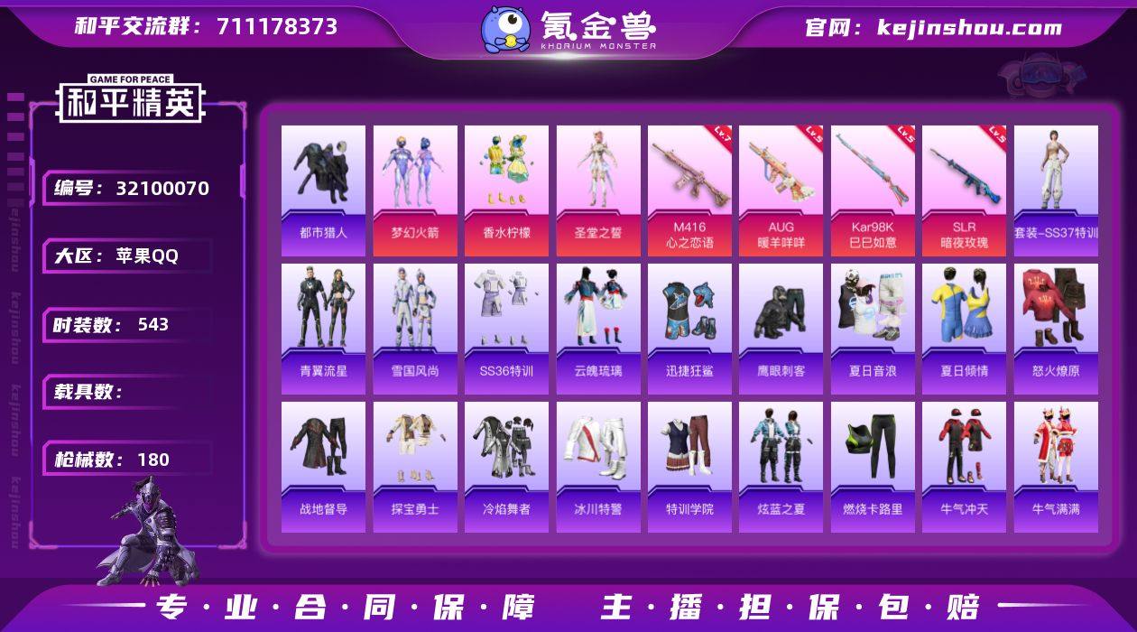 【主播推荐】实名: 不可修改 时装数: 543 枪械数: 180 战备数: 118 热门装扮: 梦幻火箭(新101),迅捷狂鲨,鹰眼刺客,都市猎人,香水柠檬,圣堂之誓 稀有枪皮: M416心之恋语,SLR暗夜玫瑰,Kar98K-巳巳如意,AUG-暖羊咩咩